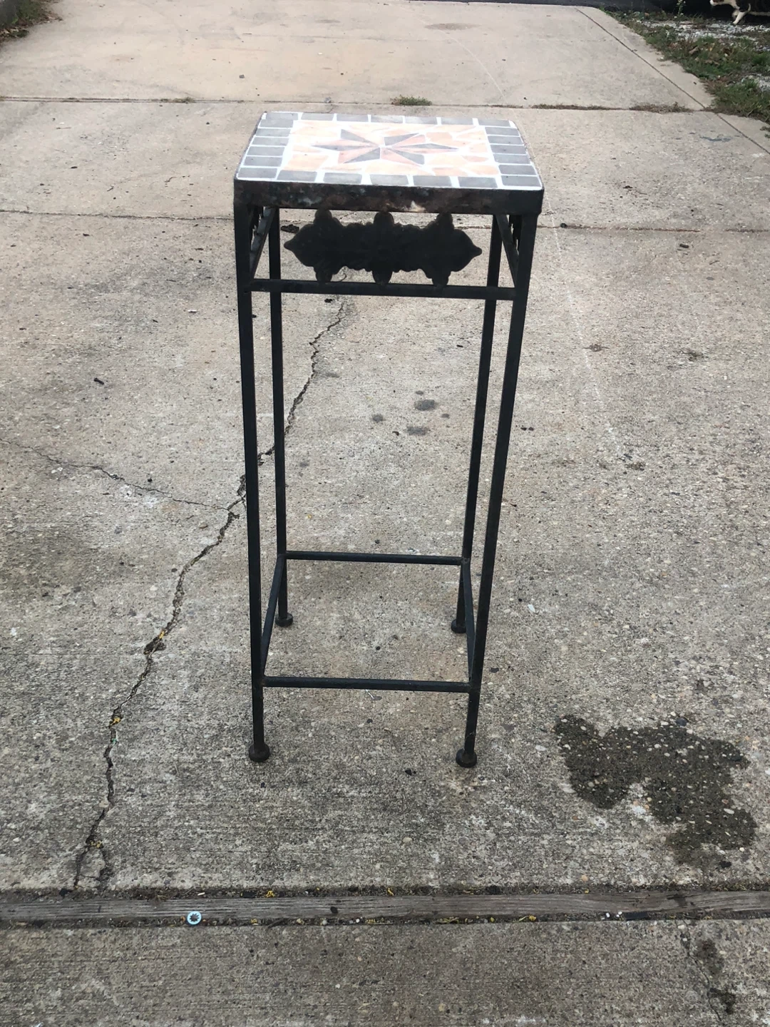 Mosaic tile plant stand! The top features a star pattern in brown, black, and white tiles. It has a black metal frame. A little surface rust. It would be perfect for displaying your favorite plant. 9” x 9” 23.5”