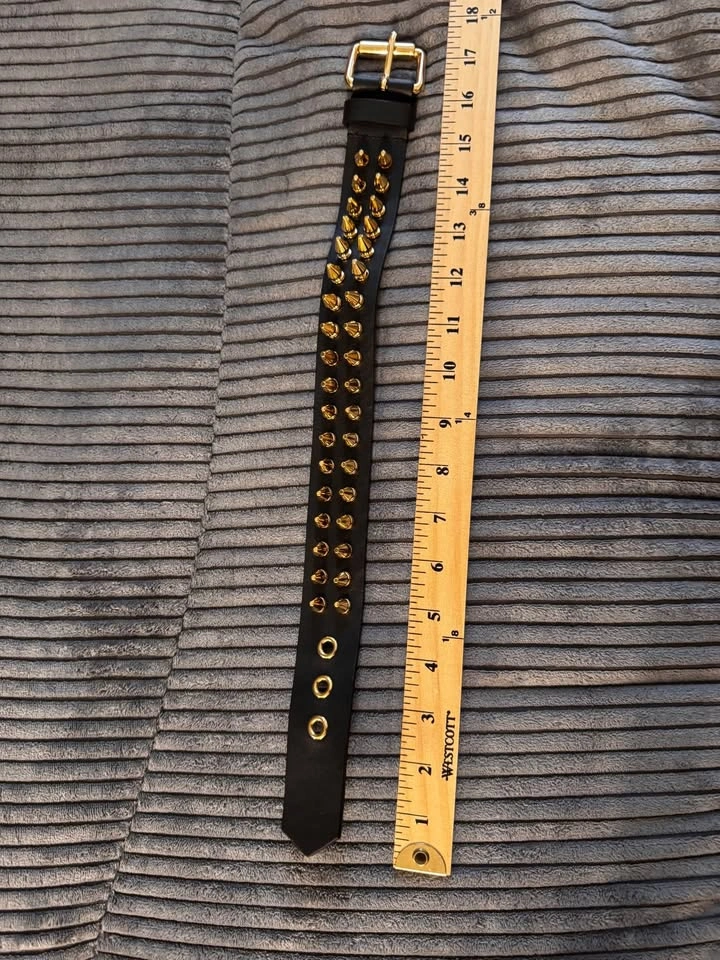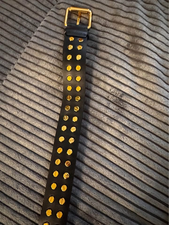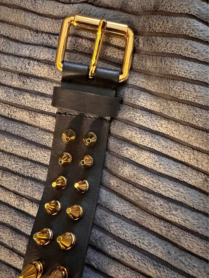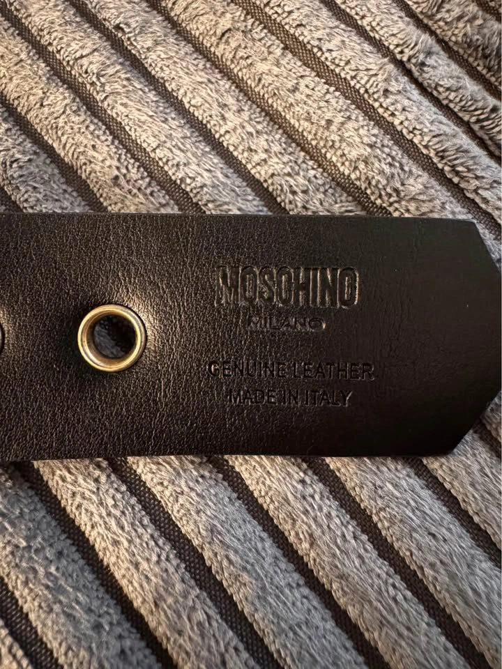 Bold and edgy Moschino Milano choker crafted from genuine black leather with gold-tone hardware and stud detailing. • Authentic Moschino • “Genuine Leather – Made in Italy” embossed • Gold cone studs + heavy-duty square buckle • Approx. 17 inches long – ideal for neck or layered as a high-fashion accessory • Unisex style – perfect for fashion-forward looks • Excellent condition 🛍️ Retail-level quality and luxury design at a great price. 📍Pickup in Brooklyn