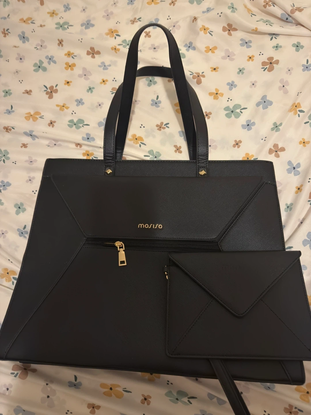 I'm selling a black MOSISO tote bag that comes with a matching pouch! It's in great condition and has a sleek, professional look. Perfect for work or everyday use Price clearence