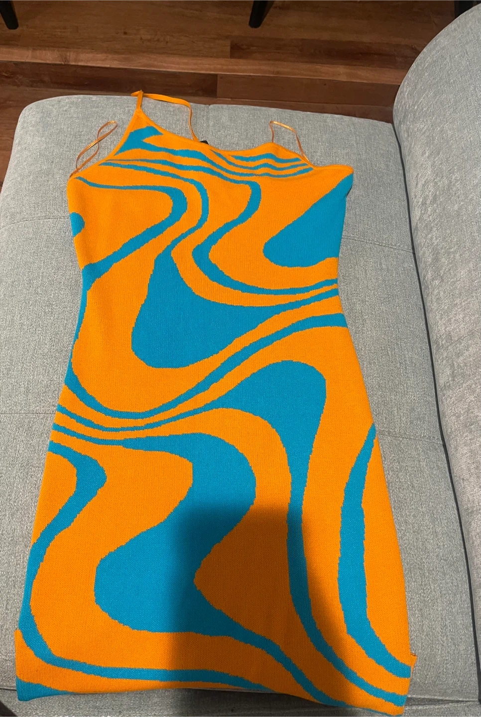 This is a Motel Rocks mini dress with an orange and blue wave pattern. It's in great condition and would be perfect for summer!