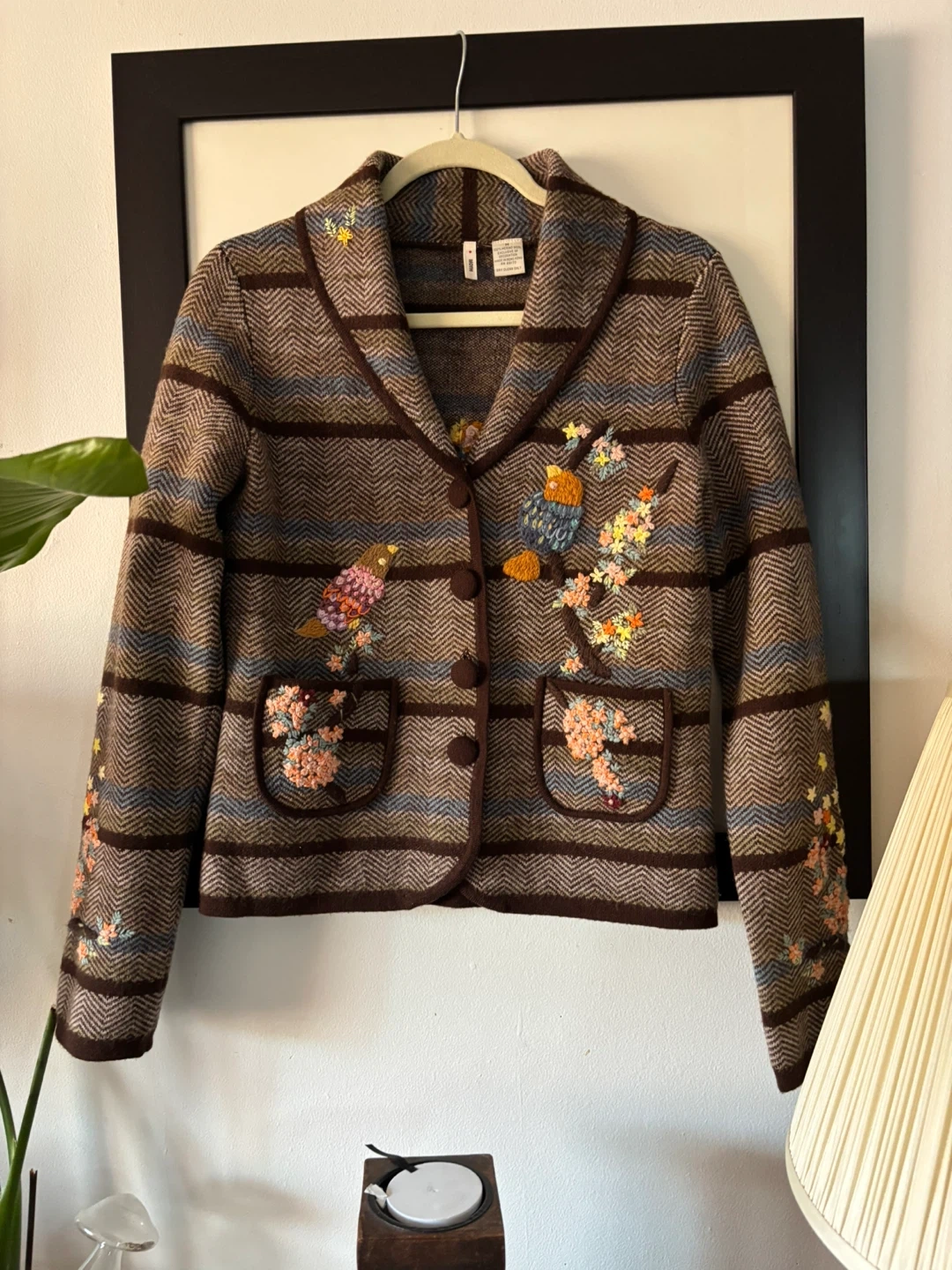 28Selling a cute Moth jacket with embroidered birds and floral designs. It features a brown herringbone pattern with blue and tan stripes. The jacket has a collared neckline, button closure, and two front pockets with matching embroidery. Perfect for adding a touch of whimsy to your wardrobe!