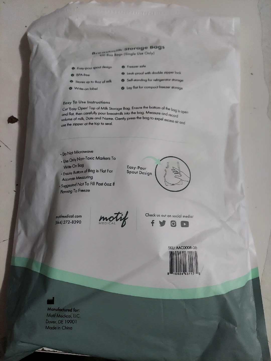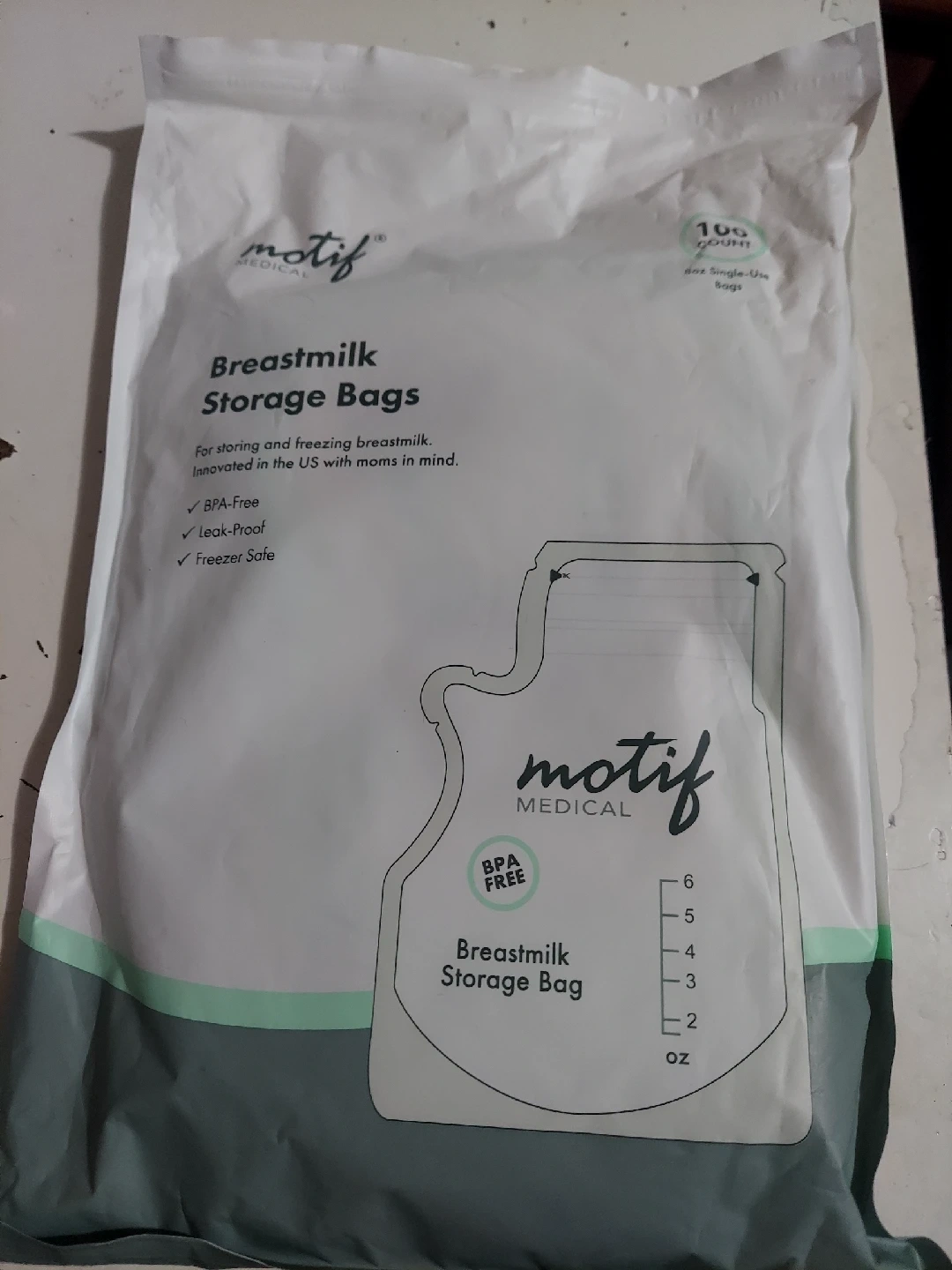 12I have Motif Medical Breastmilk Storage Bags for sale! These bags are designed for storing and freezing breastmilk, and are BPA-free, leak-proof, and freezer safe. They feature an easy-pour spout design, a double zipper lock, and a write-on label. Each bag can store up to 6oz of milk. They are also self-standing for refrigerator storage and lay flat for compact freezer storage