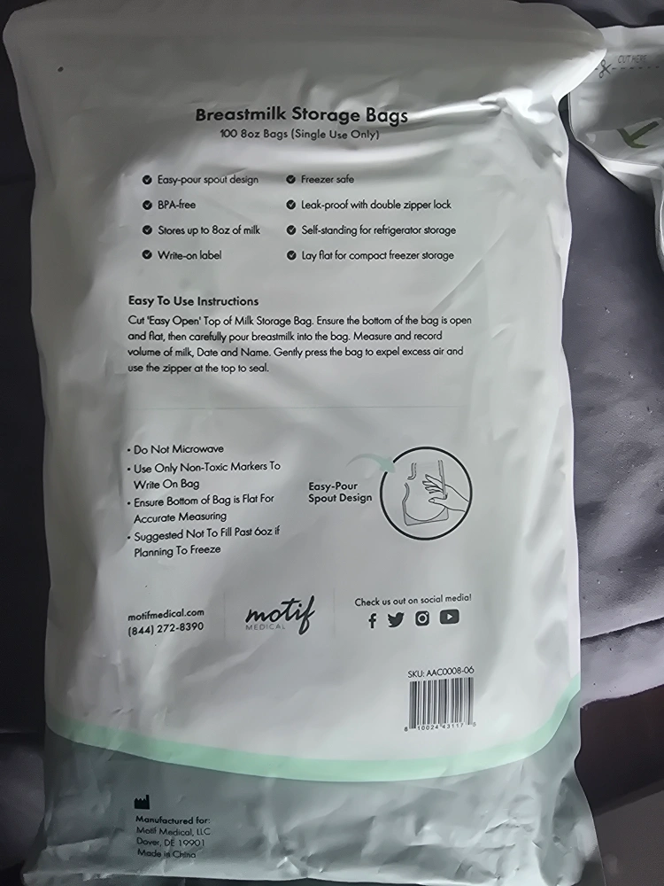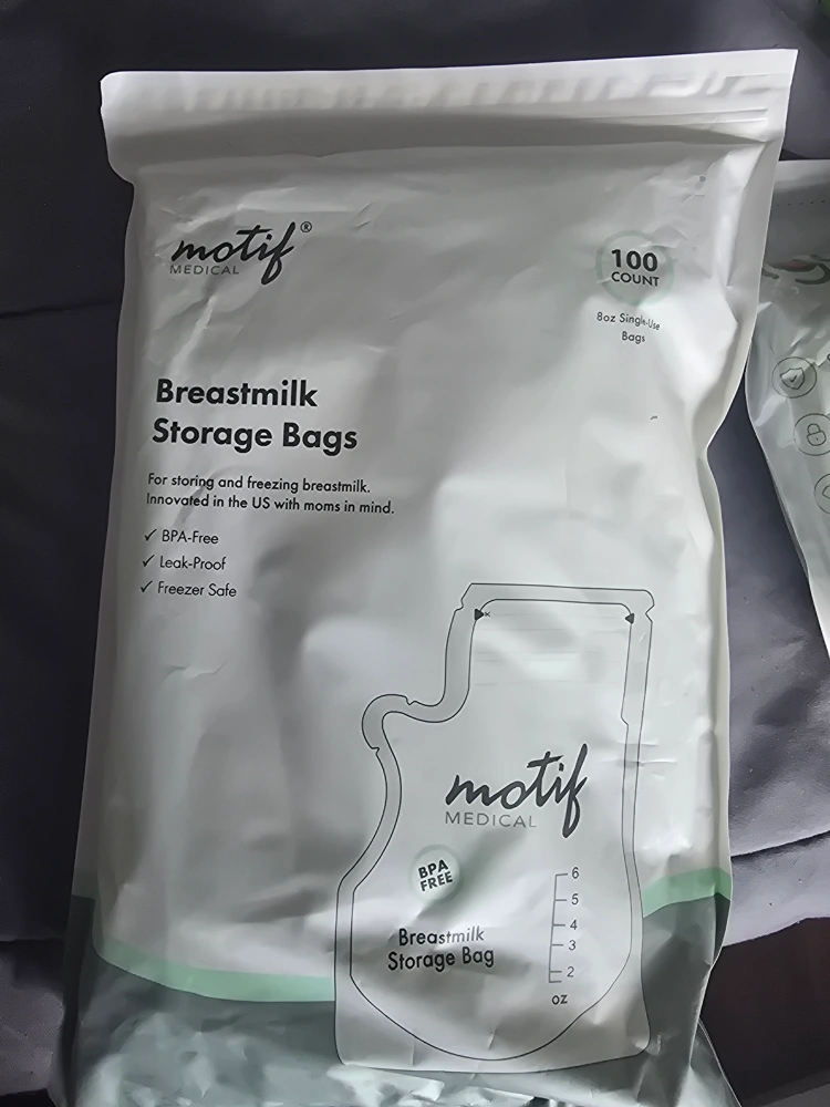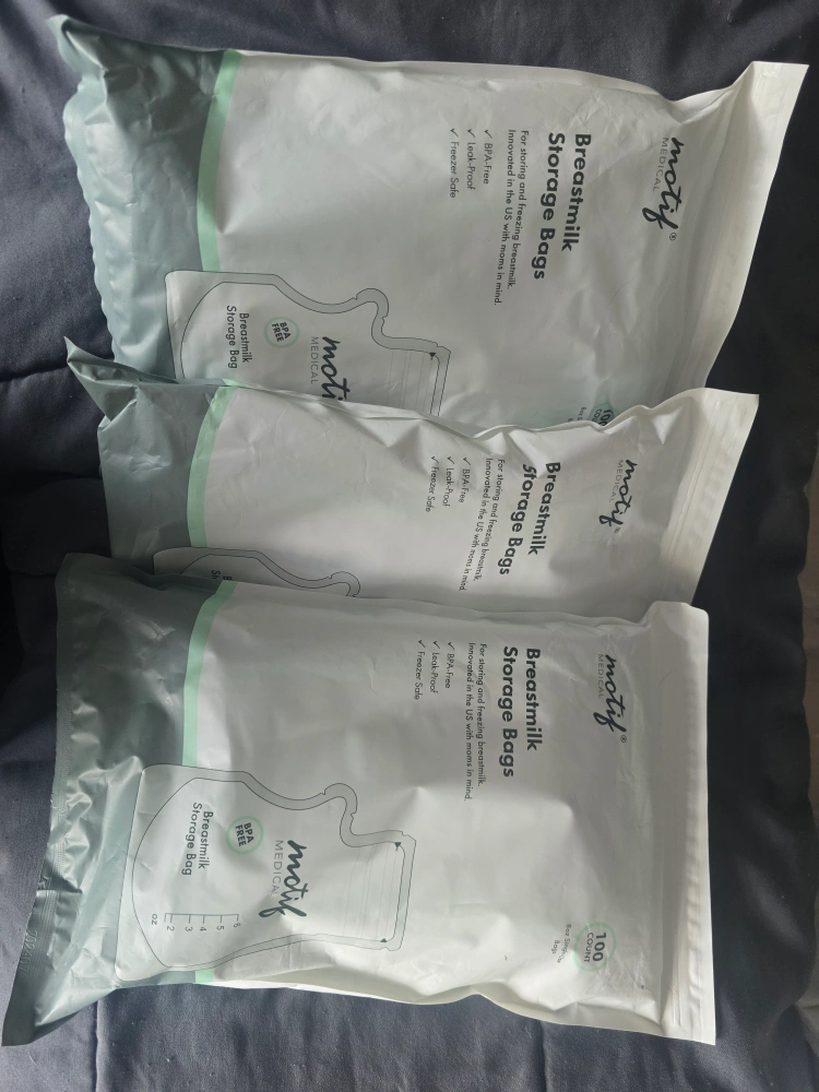 I have three packs of Motif Medical Breastmilk Storage Bags for sale! Each pack contains 100 bags, and each bag holds up to 8oz of milk. They are BPA-free, leak-proof, and freezer safe. They also have an easy-pour spout design and a write-on label for easy organization