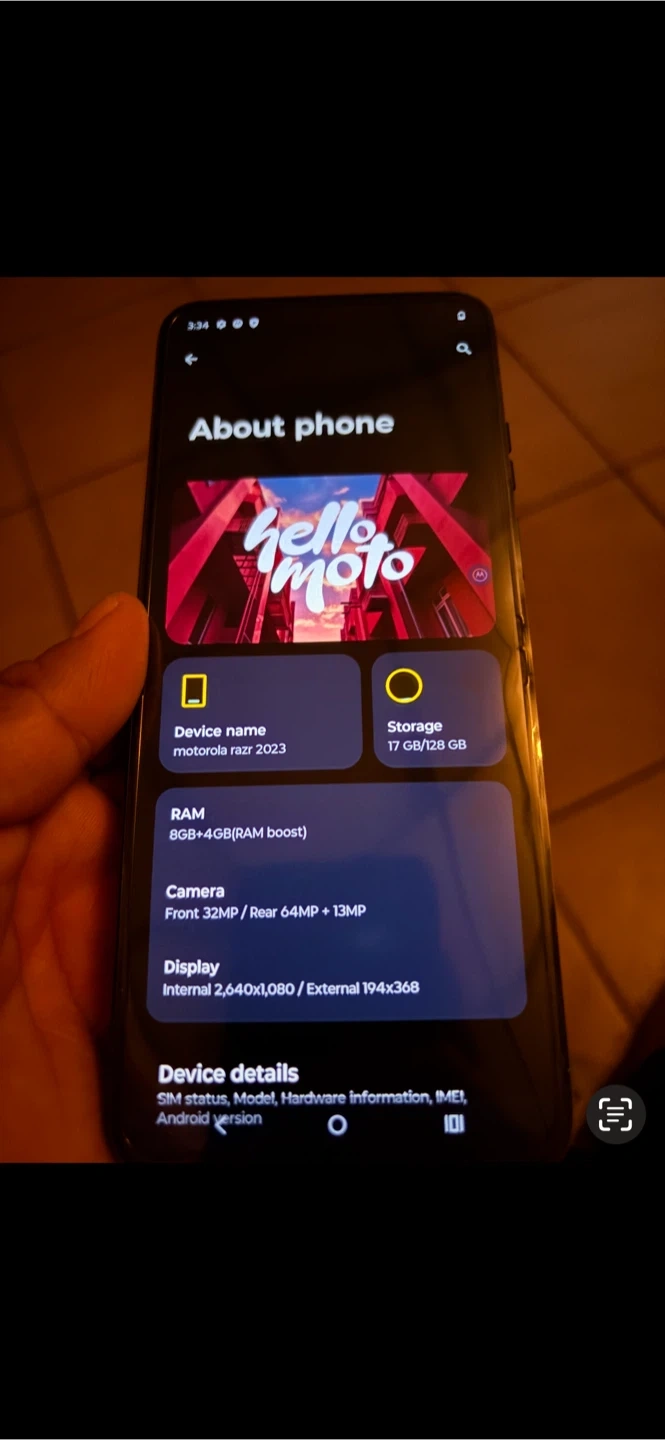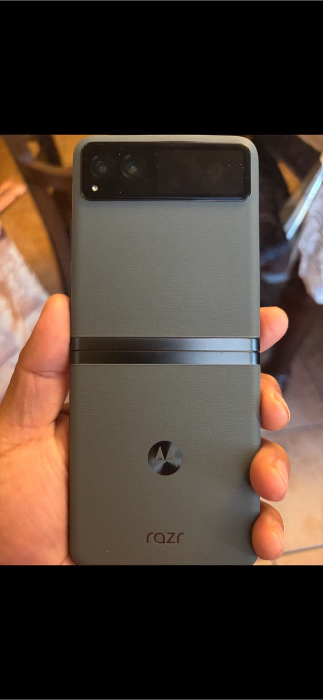 Selling a Motorola Razr 2023 with 128GB of storage. It has 8GB of RAM + 4GB (RAM boost). The front camera is 32MP and the rear camera is 64MP + 13MP. The display resolution is 2,640x1,080 internal and 194x368 external Compatible with boost but can be unlocked to any provider