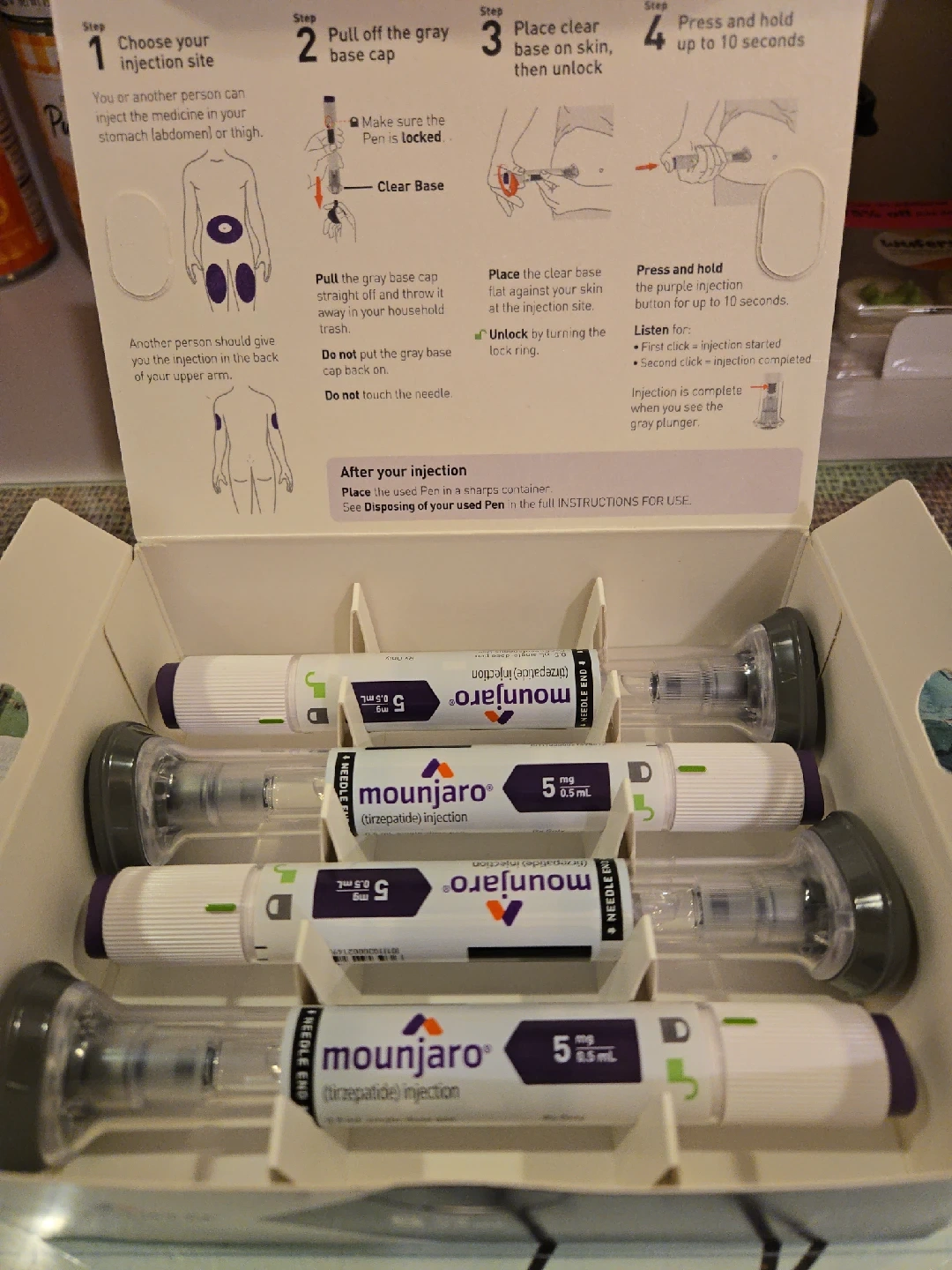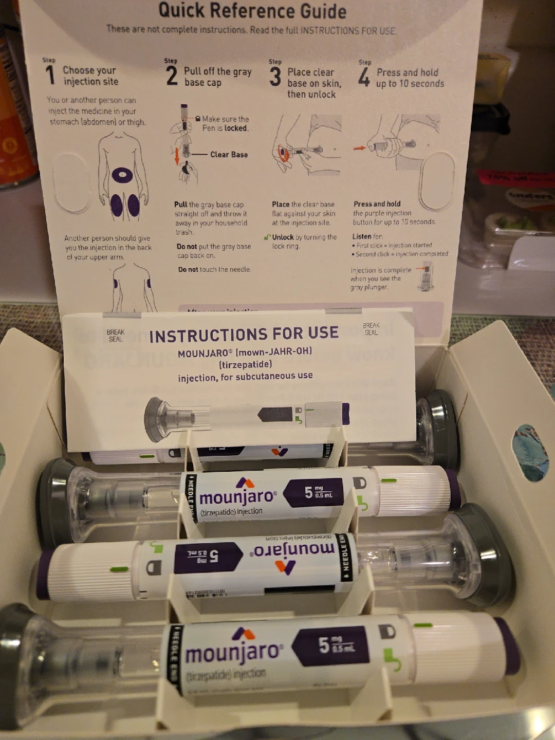 66Selling a box of Mounjaro (tirzepatide) injection, containing 4 single-dose prefilled pens. Each pen contains 5mg/0.5mL. The expiration date is April 16, 2027. Instructions for use are included in the box. Will sell separately or 600 for the box.paid out of pocket over $1000. asking 150 for individual pens or 600 for the box.