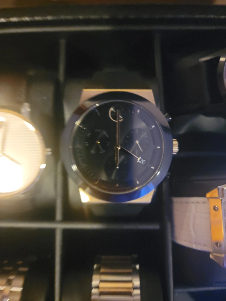 10Selling a Movado Swiss Made watch. It has a black face and a gold-colored case. The watch is in good condition and ready to wear