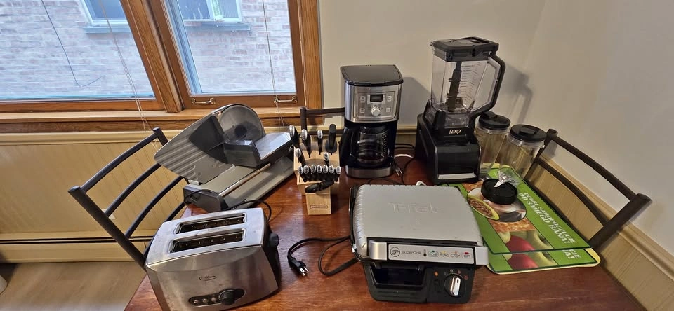 Move Out Sale! Prices listed or best offer. Window AC 5000btu/h $50 Futon $75 Food Slicer $20 Tfal grill & panini $25 Toaster $15 Ninja Blender $80 Cuisinart Coffee maker $40 3 shelf rack $40 6 drawer dresser $200 Shredder $40