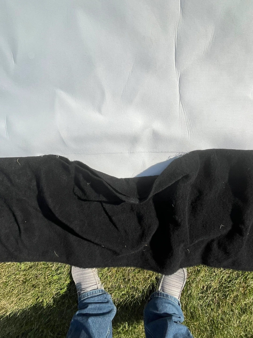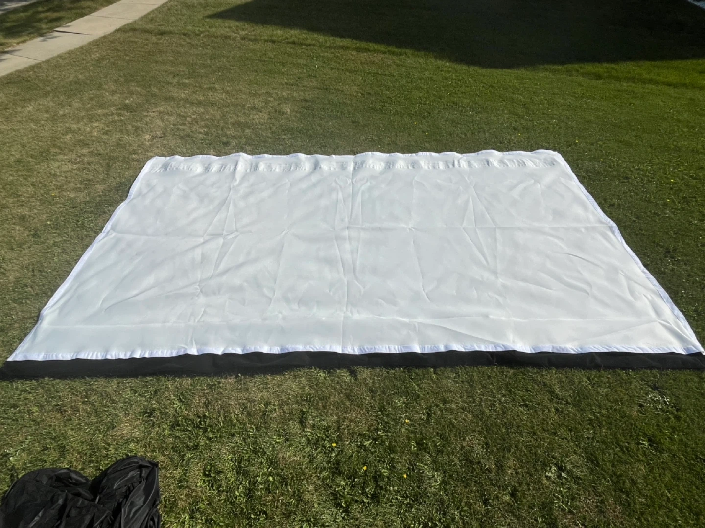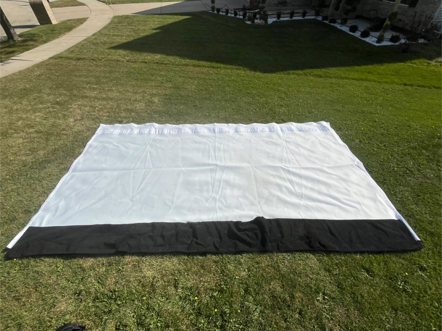 This was used as a golf simulator screen but could be used as a movie theater screen. Since it was used as a golf simulator screen, there are some marks on the screen from its use. The black boarder on the bottom is sewn on and the sewing is coming apart and is about 12” and is pictured. The screen is approximately 8’ tall and 17’ wide. It was held up through velcro but it comes with some drop ceiling hangers (pictures and approximately 12) along with a bunch of small bungee cords (approximately 50-60). I was going to get some grommets to use the bungee cords to attached to a pvc frame and use it for an outdoor movie theater. I’m no longer doing that and getting rid of the screen. If you are interested, please let me know.