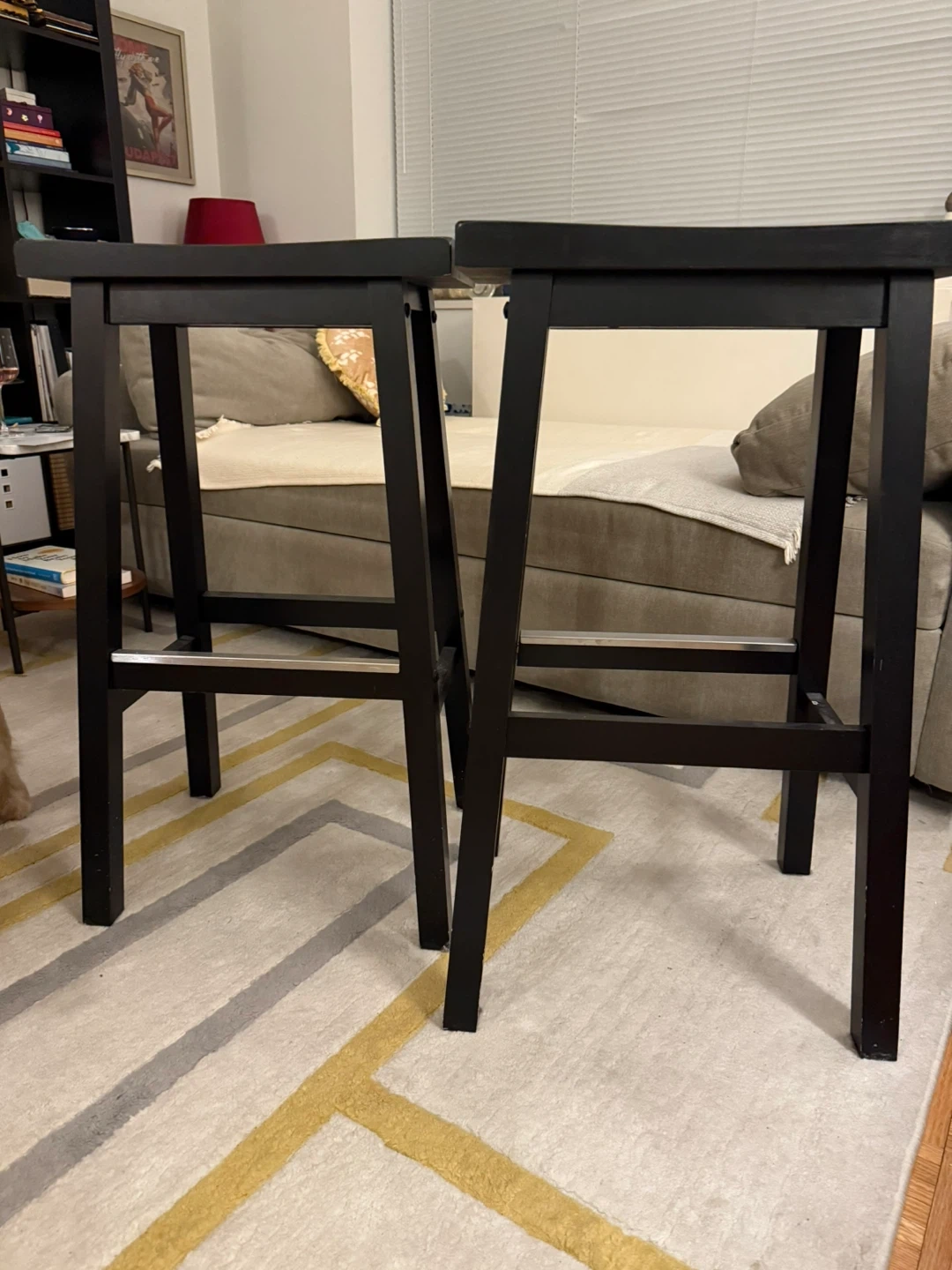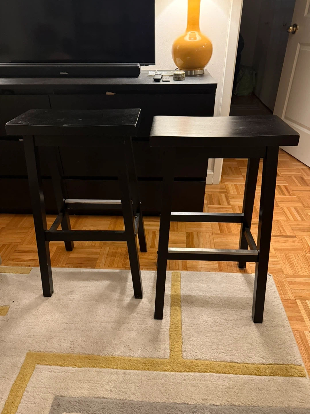 Selling a set of two bar stools in black! They're in great shape and ready to add some style to your kitchen or bar area. These stools are sturdy and comfortable, perfect for enjoying meals or drinks at your counter