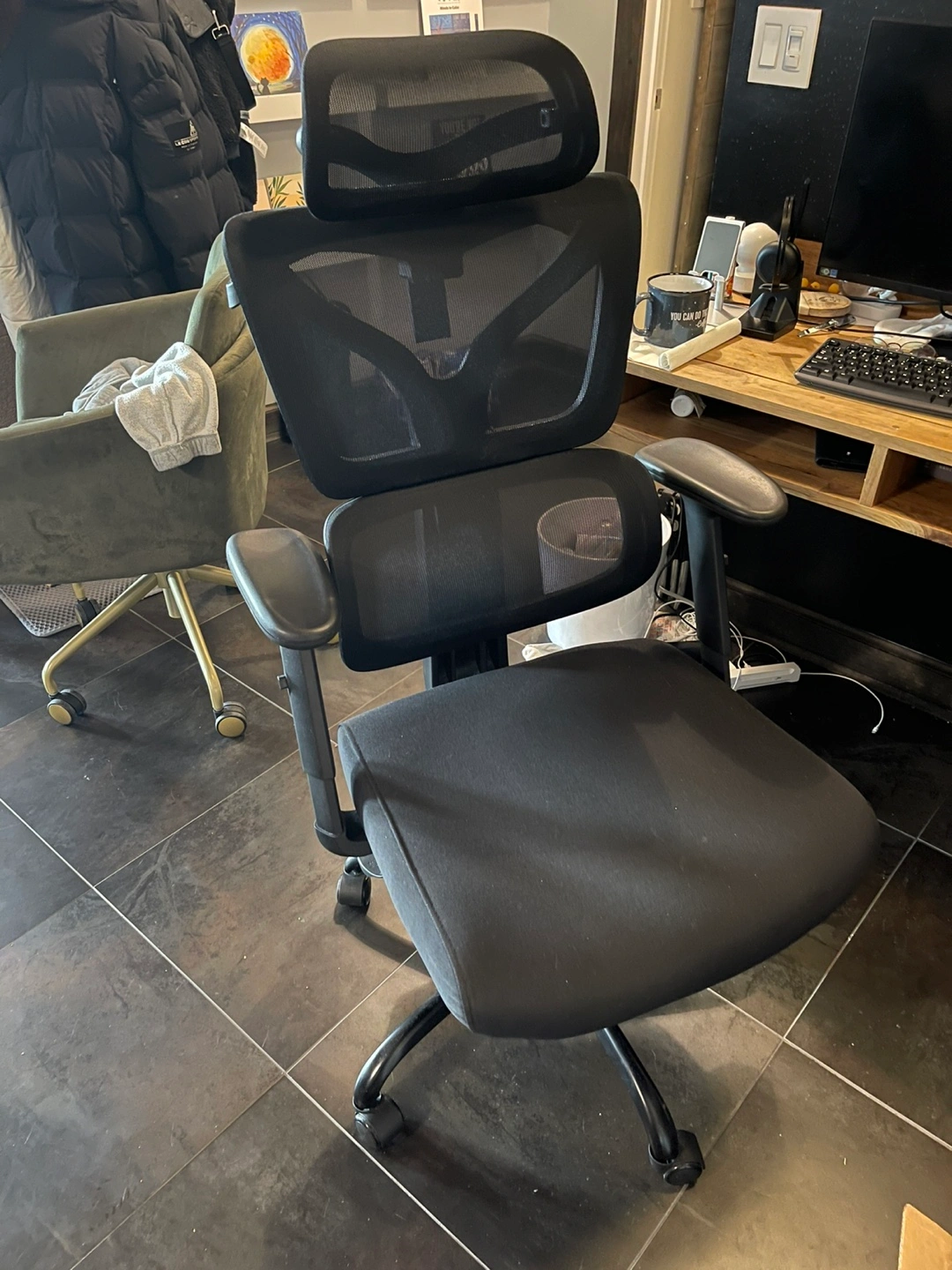 68[MOVING SALE!!] Everything needs to be gone by July 24th!! • Purchased from Amazon in March, 2024 • Selling a mesh, ergonomic office desk chair in great condition! This ergonomic office chair is designed for comfort and support during long work hours, featuring with adjustable lumbar support, headrest, armrests, and recliner. The breathable mesh back keeps you cool, and the chair's sturdy construction ensures durability. Perfect for a home office or workspace! • Reference: https://a.co/d/2zeylJX