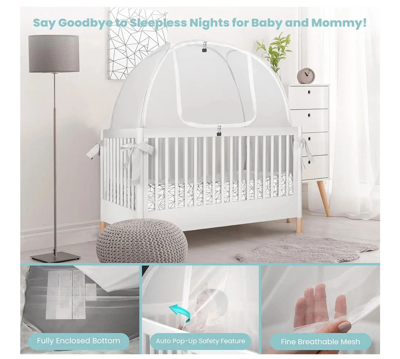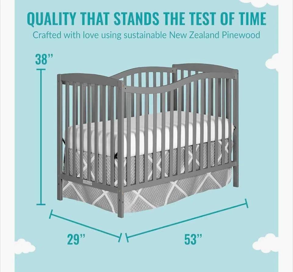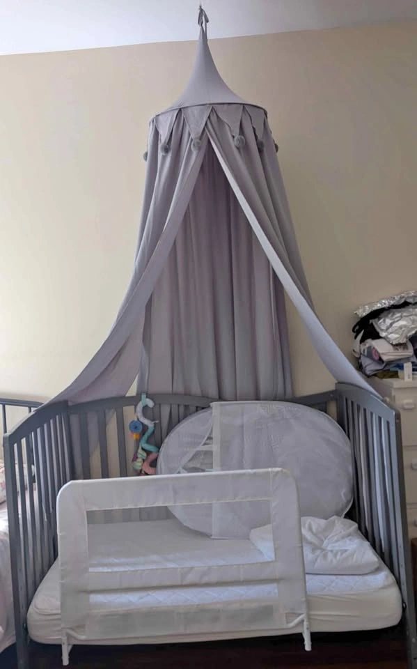 Dream On Me Chelsea 5-in-1 Convertible Full-Size Baby Crib (grey). GreenGuard Gold & JPMA certified, pinewood, 4 mattress heights. Converts to toddler, day & full-size bed. Modern classic nursery style. There are some wears. Breathable mesh crib tent (white) to keep baby from climbing out, or pets out. Dream On Me lightweight mesh security adjustable bed rail for toddler (white). Breathable mesh fabric, suitable for all types of beds, reinforced anchor system bed guard rail. some stains but its washable. Princess canopy for kids bed (grey), kid's room decor. Graco premium crib & toddler mattress – GREENGUARD Gold Certified, CertiPUR-US Certified Foam, machine washable cover with 100% waterproof surface, fits standard full size baby crib and toddler bed. Also includes 2 mattress covers (free) and a spiral toy (free).