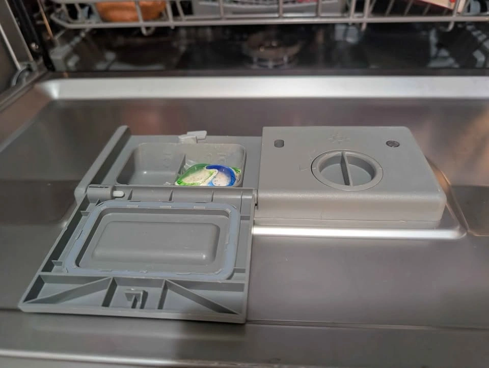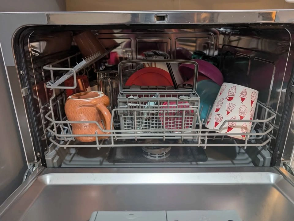 Can hold up to 6 place settings and features 6 wash programs; Includes 24-hour delay and EZ Clean removable filter. Diameter measurements is in inch. Super easy to use. The black plastic rubber band was worn out placing plates (ours are a little bit bigger than standards). It's a replaceable part. The spring that makes the cover of the machine soft open is popped out, but it is replaceable. Does not affect the machine's performance it's still fully functional. To be picked up.
