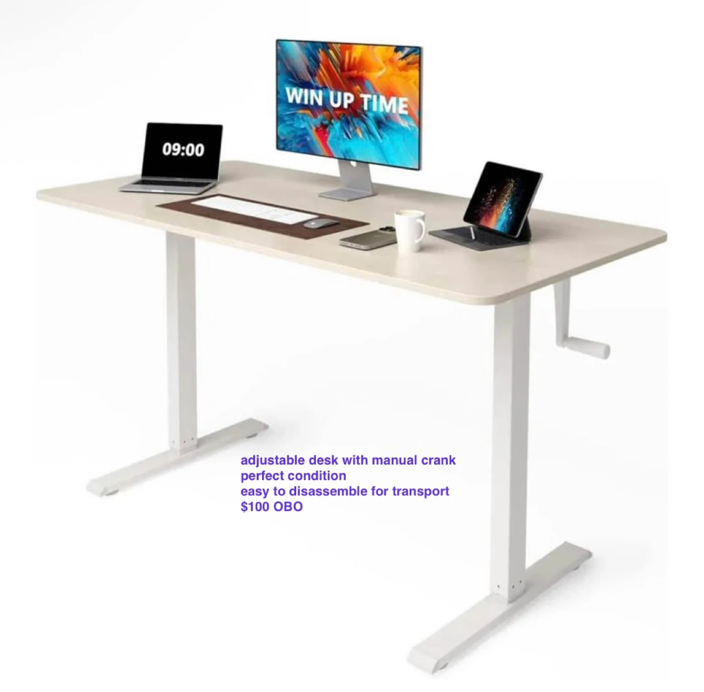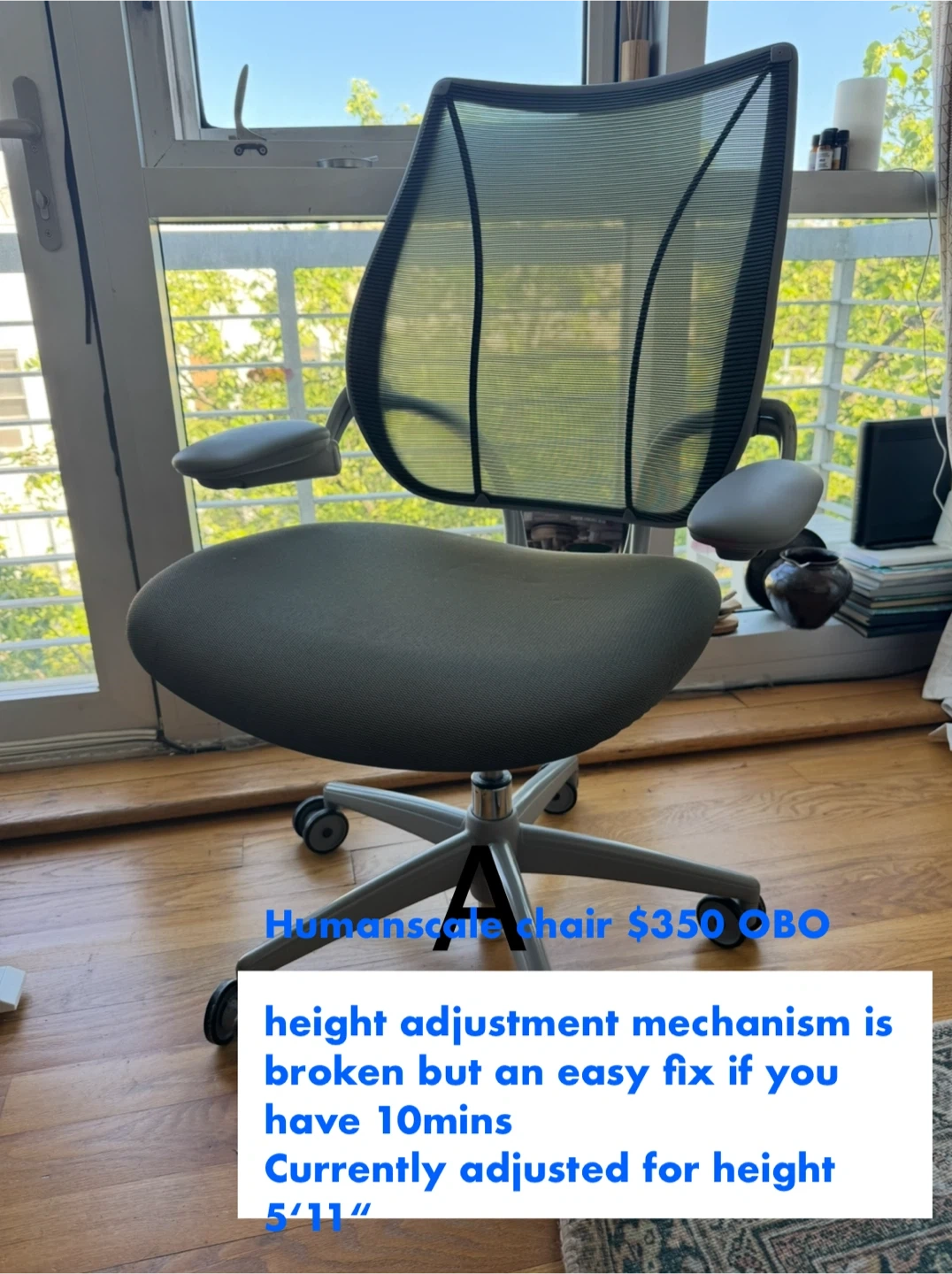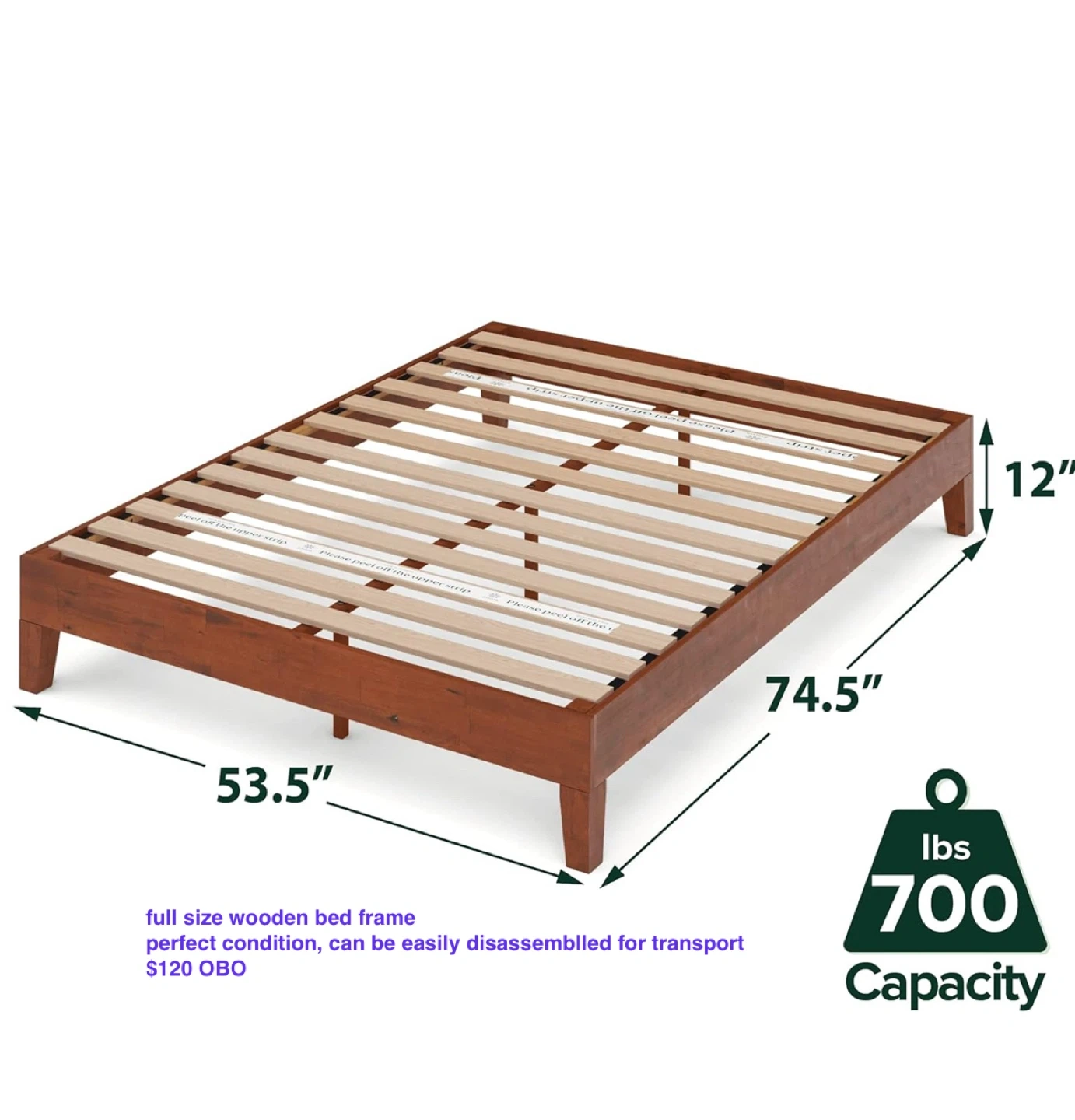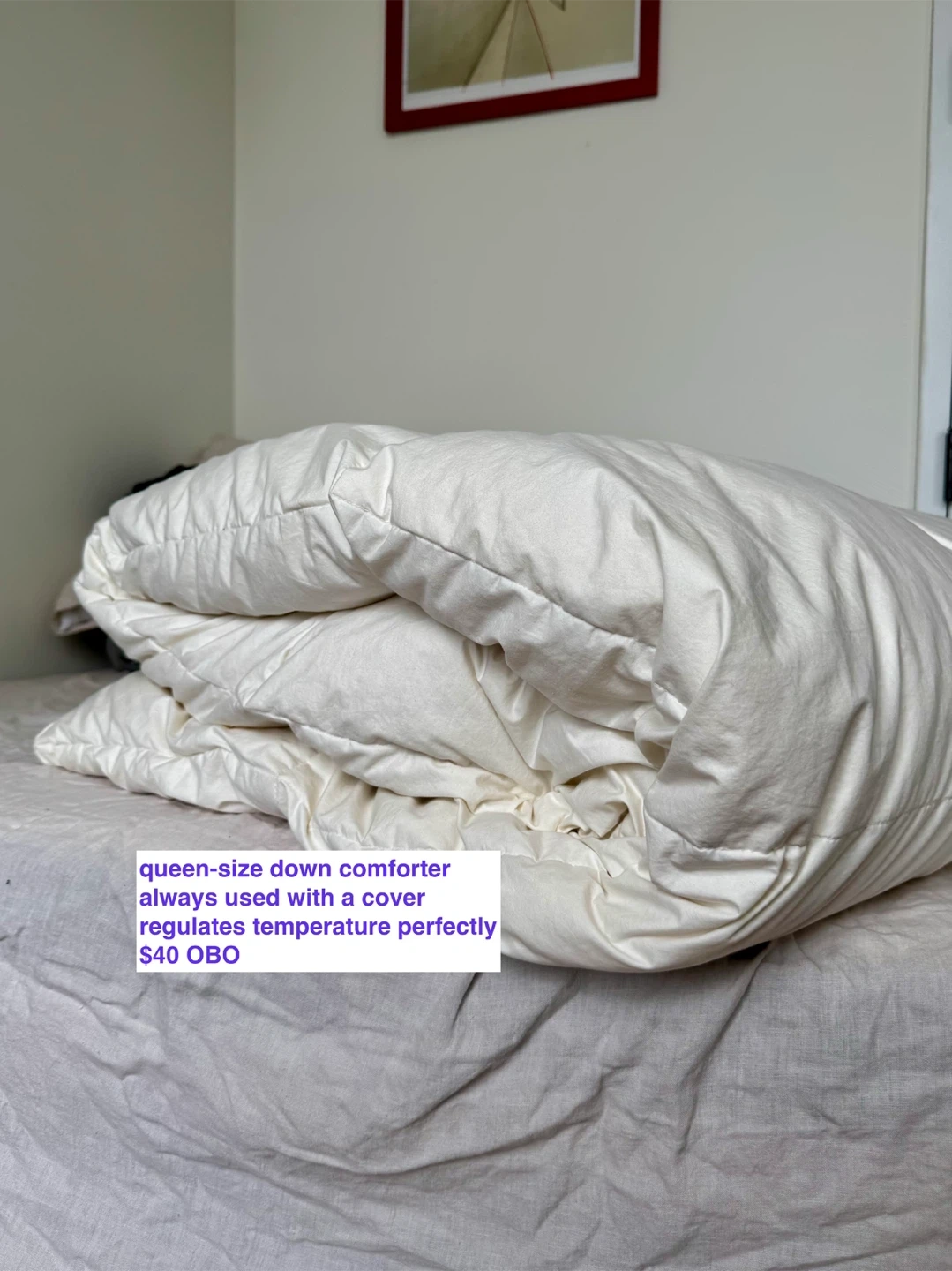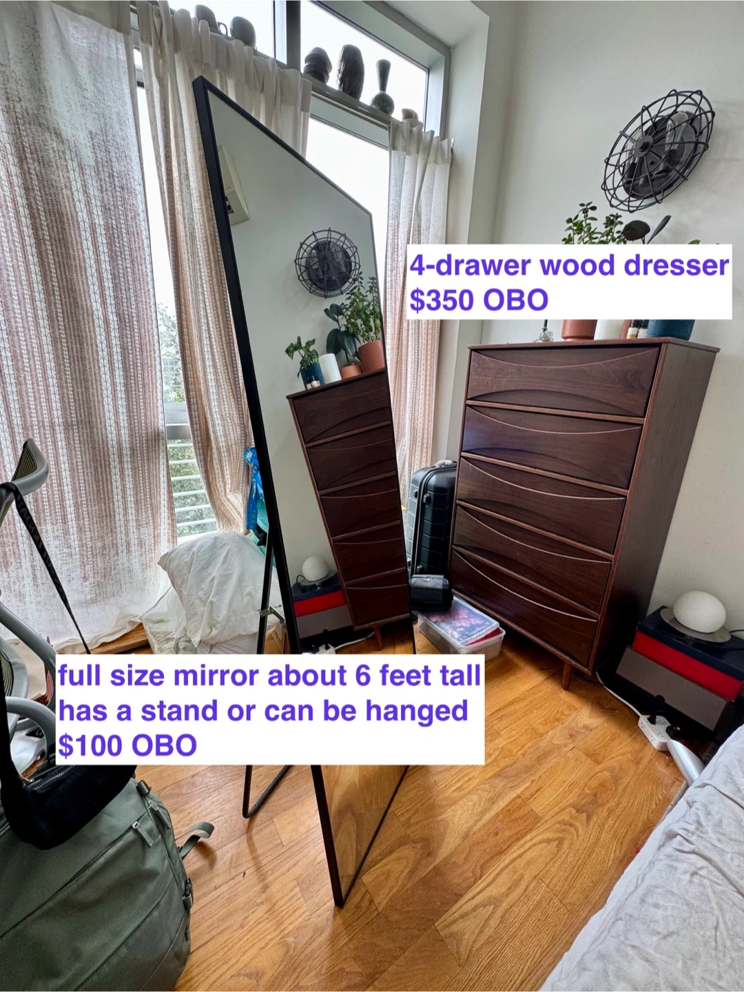 Prices are on the photos: - Full size wooden bed frame - Queen-size down comforter - humanscale chair - 4-drawer wood dresser - Full size mirror (about 6 feet tall) - Large vintage frame (approx. 15 x 24 inch) - Adjustable desk with manual crank