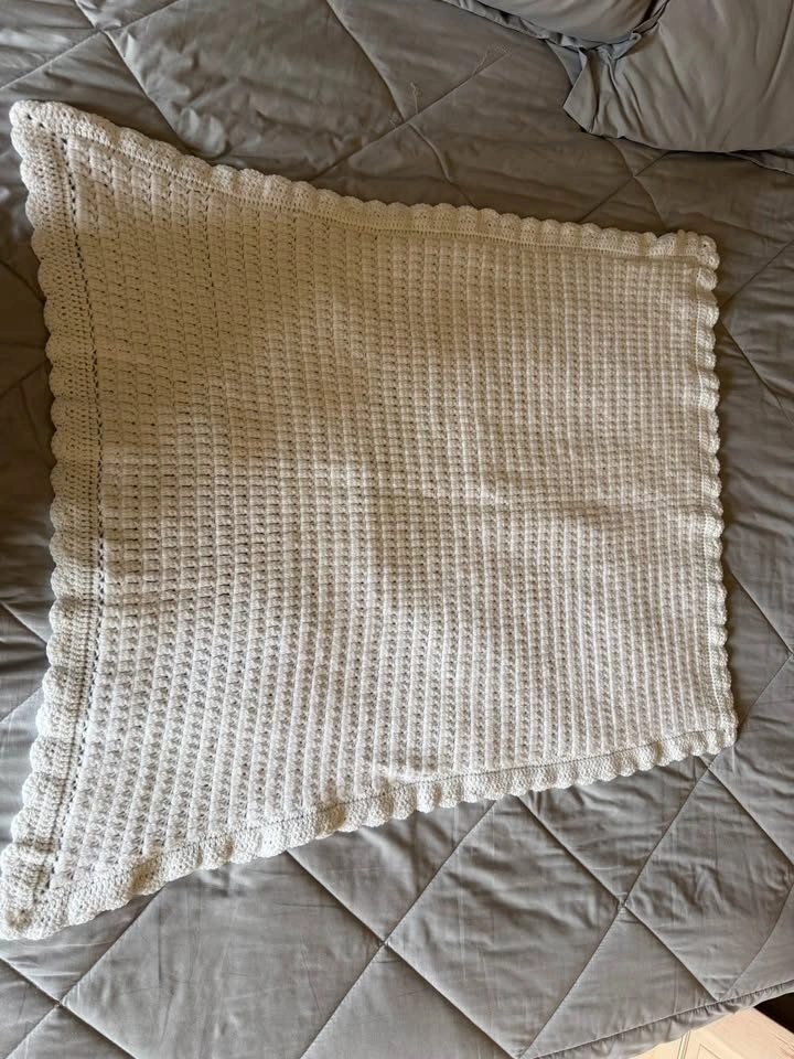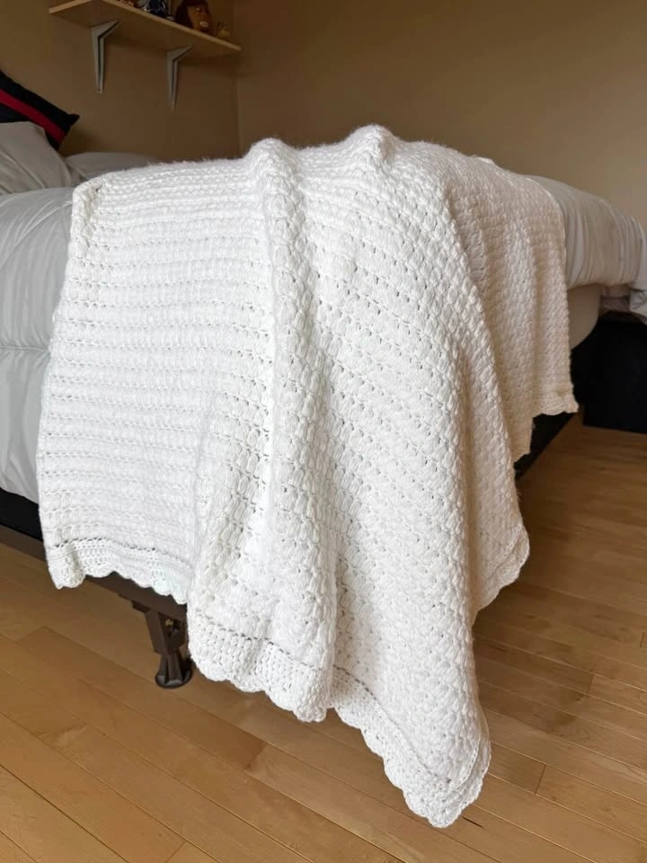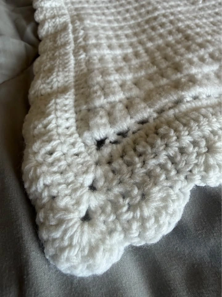 Absolutely stunning handmade crocheted afghan throw, this one is truly special! Crisp white with a beautiful waffle-stitch texture and a gorgeous scalloped border framing every edge.