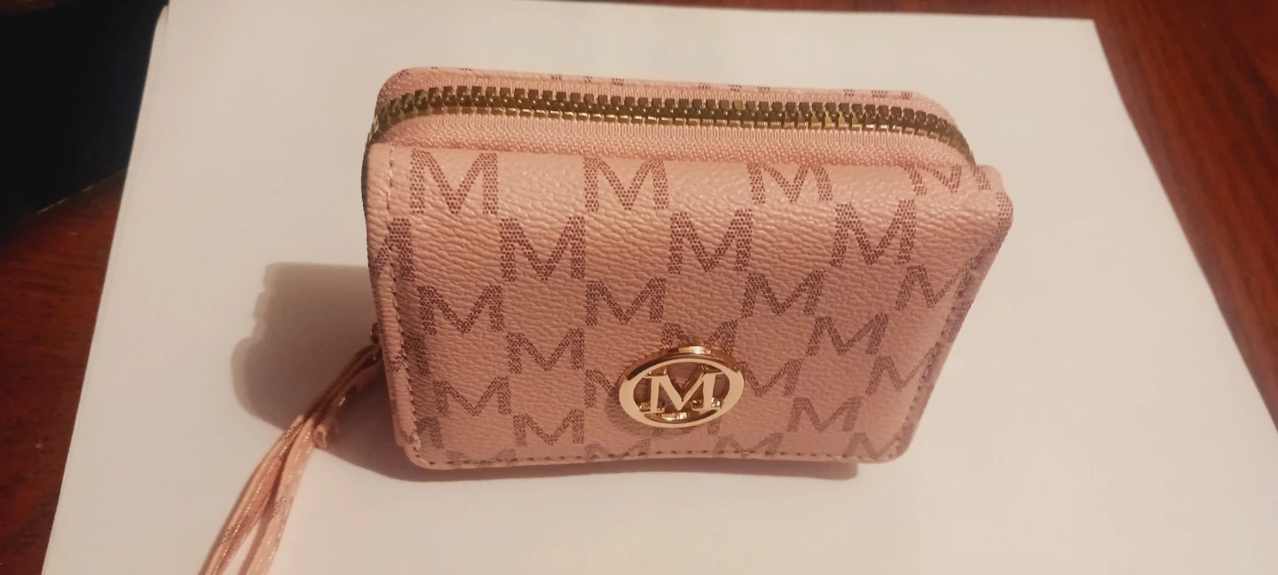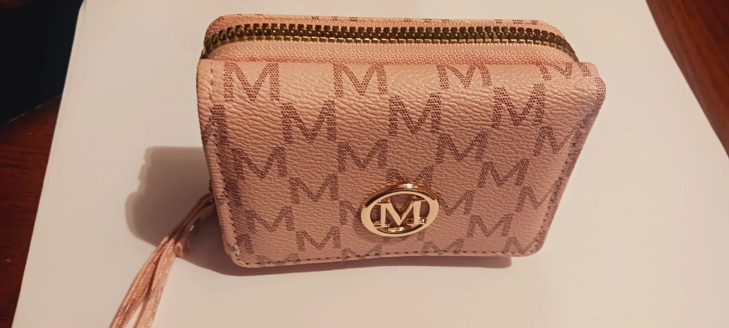 New !!! This gorgeous pink wallet features a repeating monogram pattern and a gold-tone emblem. It has multiple card slots and a clear ID window. A convenient wrist strap is attached. New !!