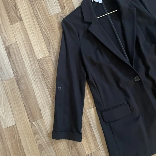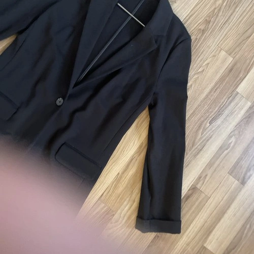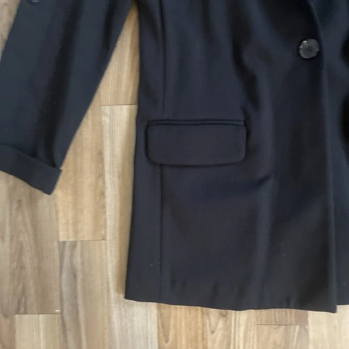 This stylish and versatile women's suit jacket in black is made from a wool blend with a viscose outer shell and polyester lining. Perfect for various occasions like parties, casual outings, or business meetings, this mid-length jacket features an asymmetrical design and long sleeves with button closures. Handcrafted in the USA, this blazer exudes a classic and designer look, making it a timeless piece suitable for fall, winter, and spring seasons. Add a touch of sophistication to your wardrobe with this high-quality and fashionable blazer.
