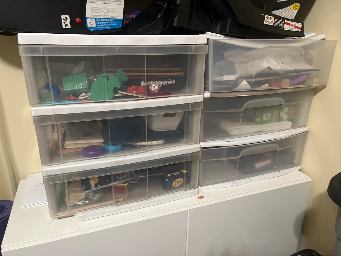 6 drawers This is a clear plastic drawer unit, great for organizing small items. It's made of durable plastic and has multiple drawers. It's perfect for a craft room or kids' play area!