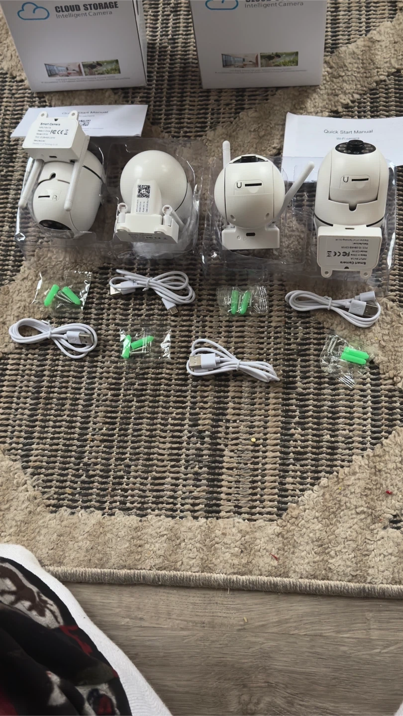 A set of 4 of the latest wireless WiFi cameras with all accessories included. Brand new and so easy to set up that anybody could install it. All you need to do is connect to your WiFi and in 3 steps you’ll be done. The cameras can swivel, tilt, rotate and more and are activated by any movement or sound. They are trained by AI to recognize animals, pets, humans and can even recognize familiar faces so it’s not set off for a false alarm every time. It can notify you wherever you are in the world and you can check in and observe anytime you like. It records and keeps all the data in your own SD Card or in the cloud storage so you could retrieve it anytime you like. You can set it up for several different modes of notifications and alarms and so many more features which are hard to list. But I can tell you that they are wonderful and secure and give you a great sense of security whether you’re at home or outside.