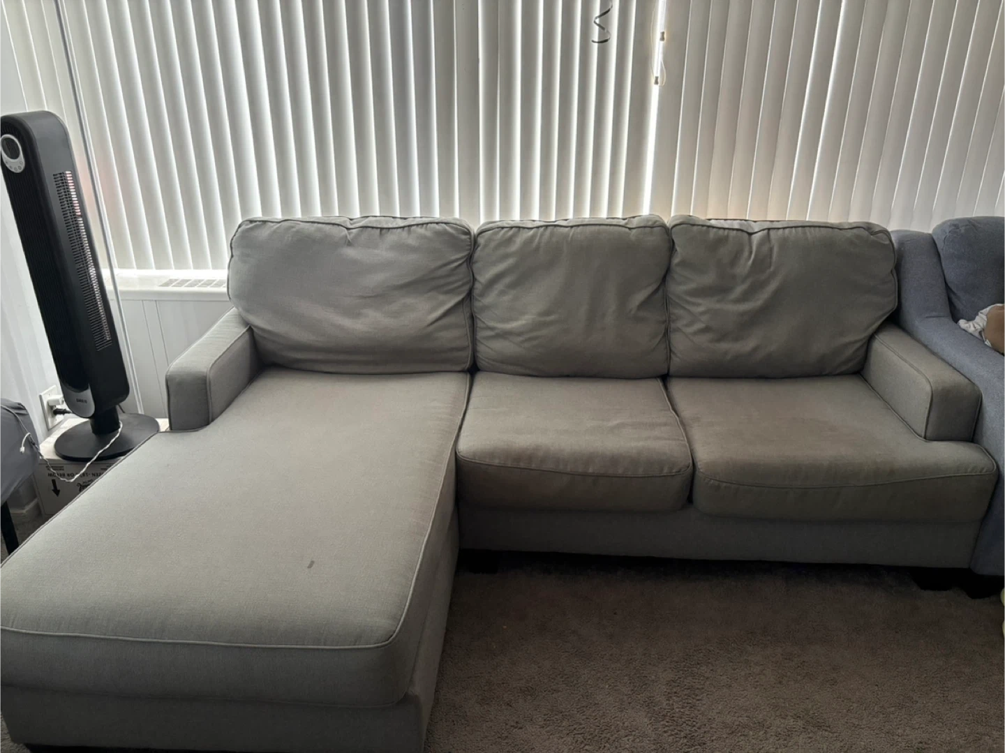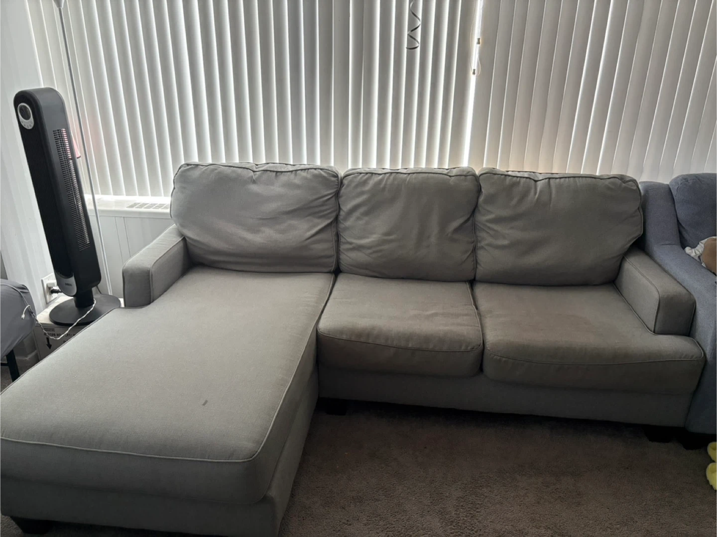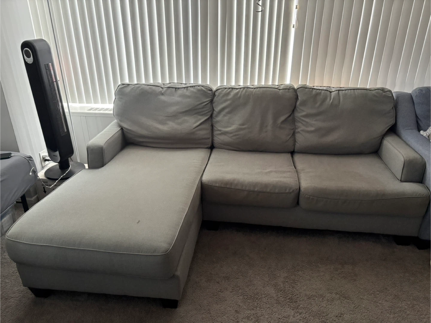 Selling a comfy gray sectional sofa. It's perfect for lounging and relaxing in your living room. This sectional features a chaise lounge for extra comfort. It's in good condition and ready for a new home!