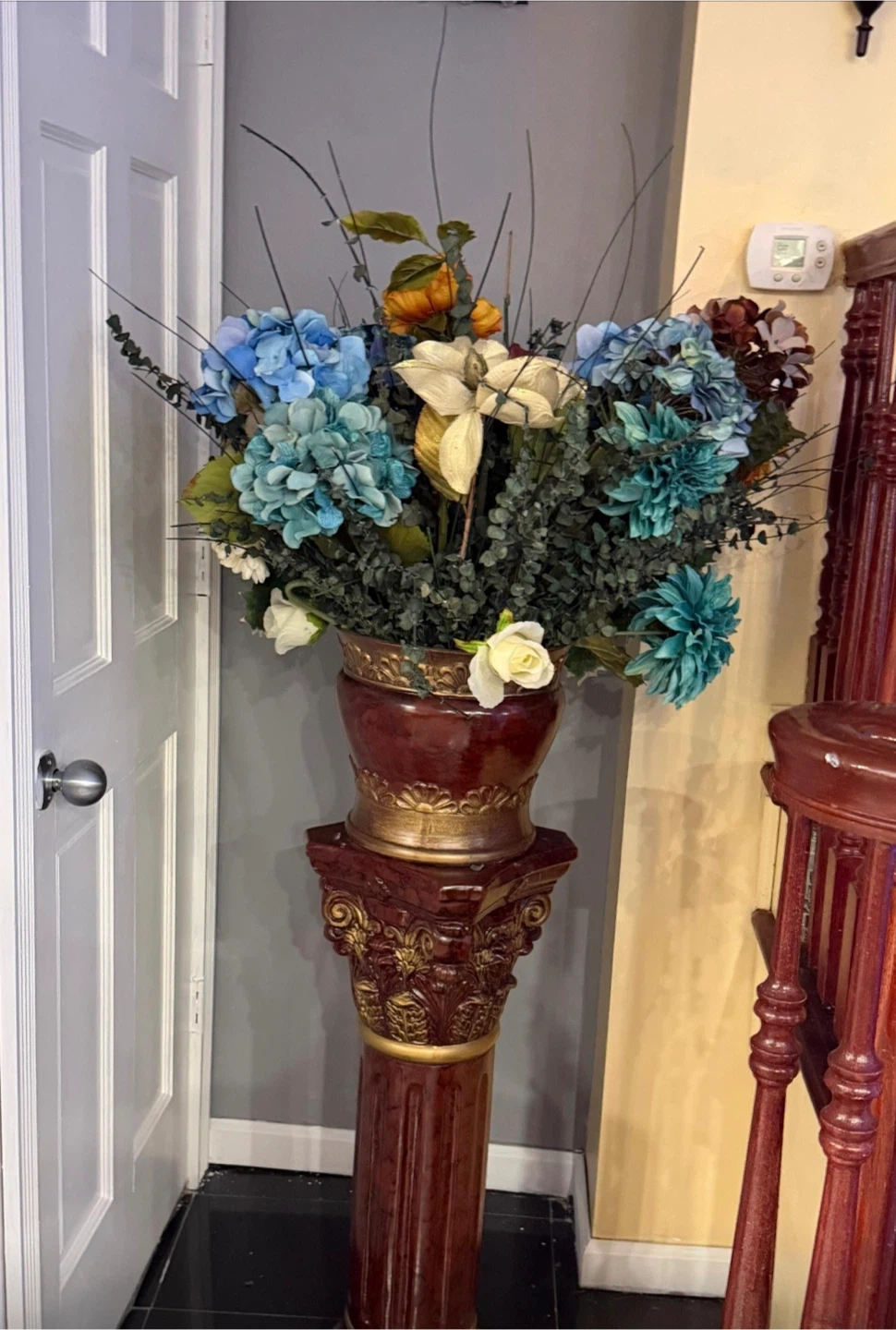 Beautiful large floral arrangement featuring hydrangeas, roses, and assorted greenery. It's housed in a decorative burgundy and gold vase on a matching pedestal. Adds a touch of elegance to any room!