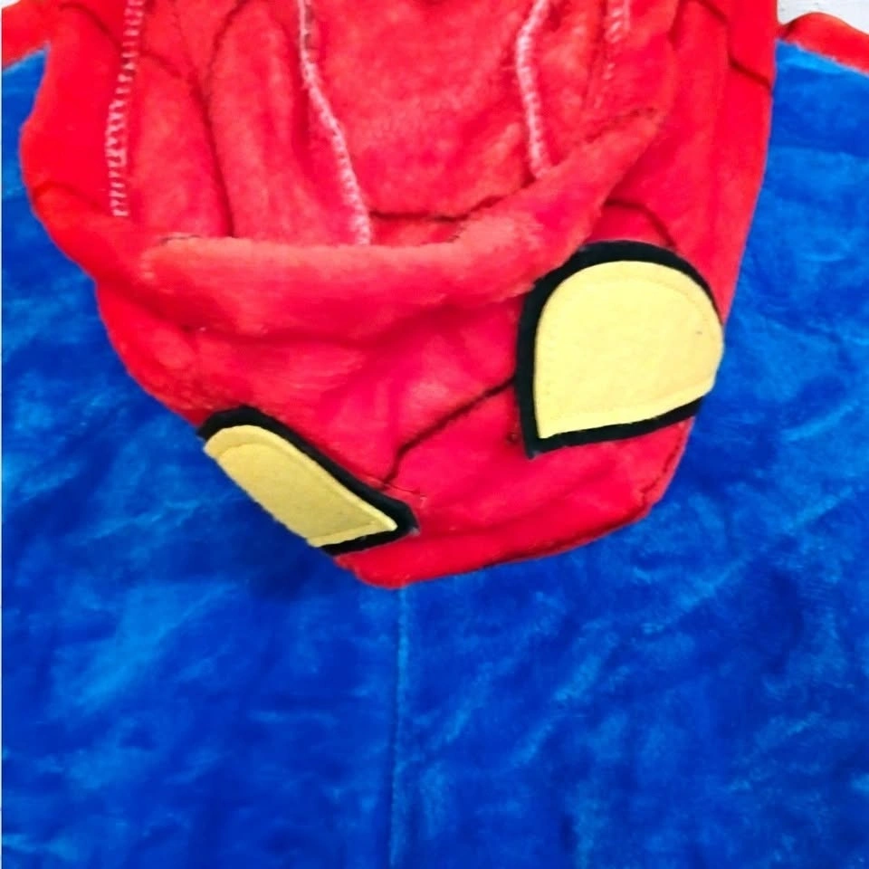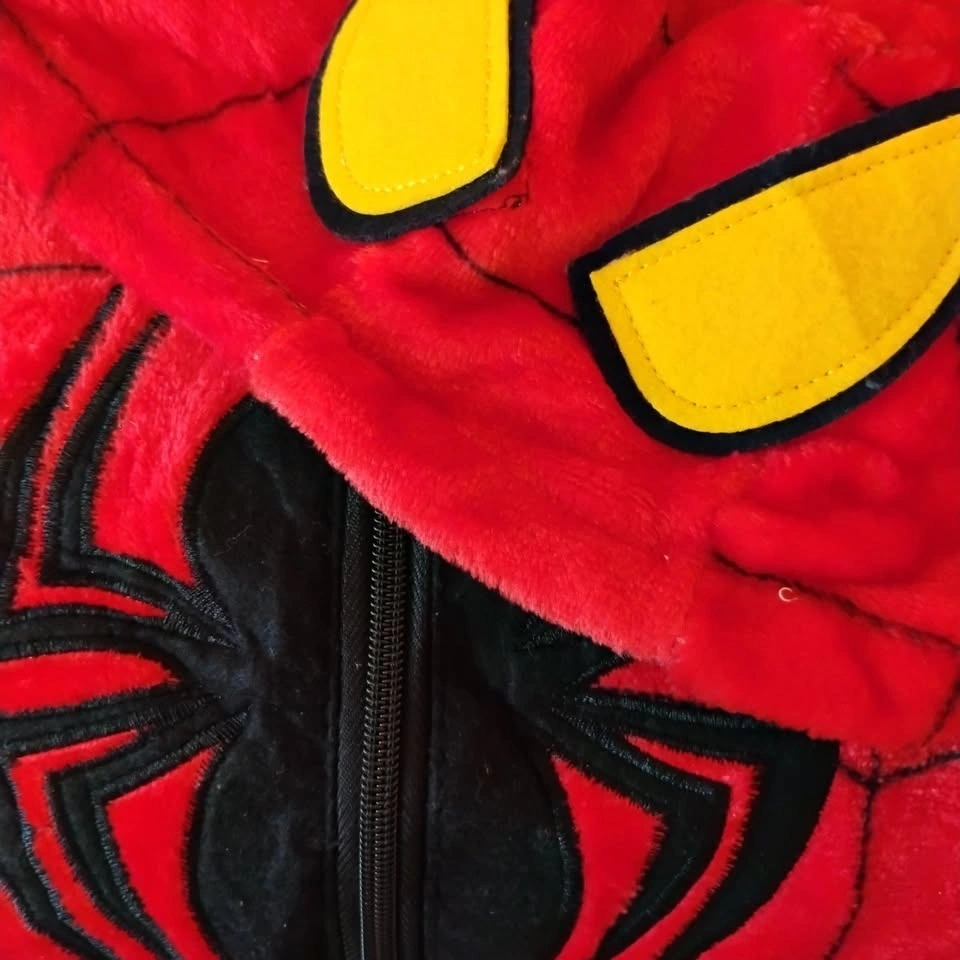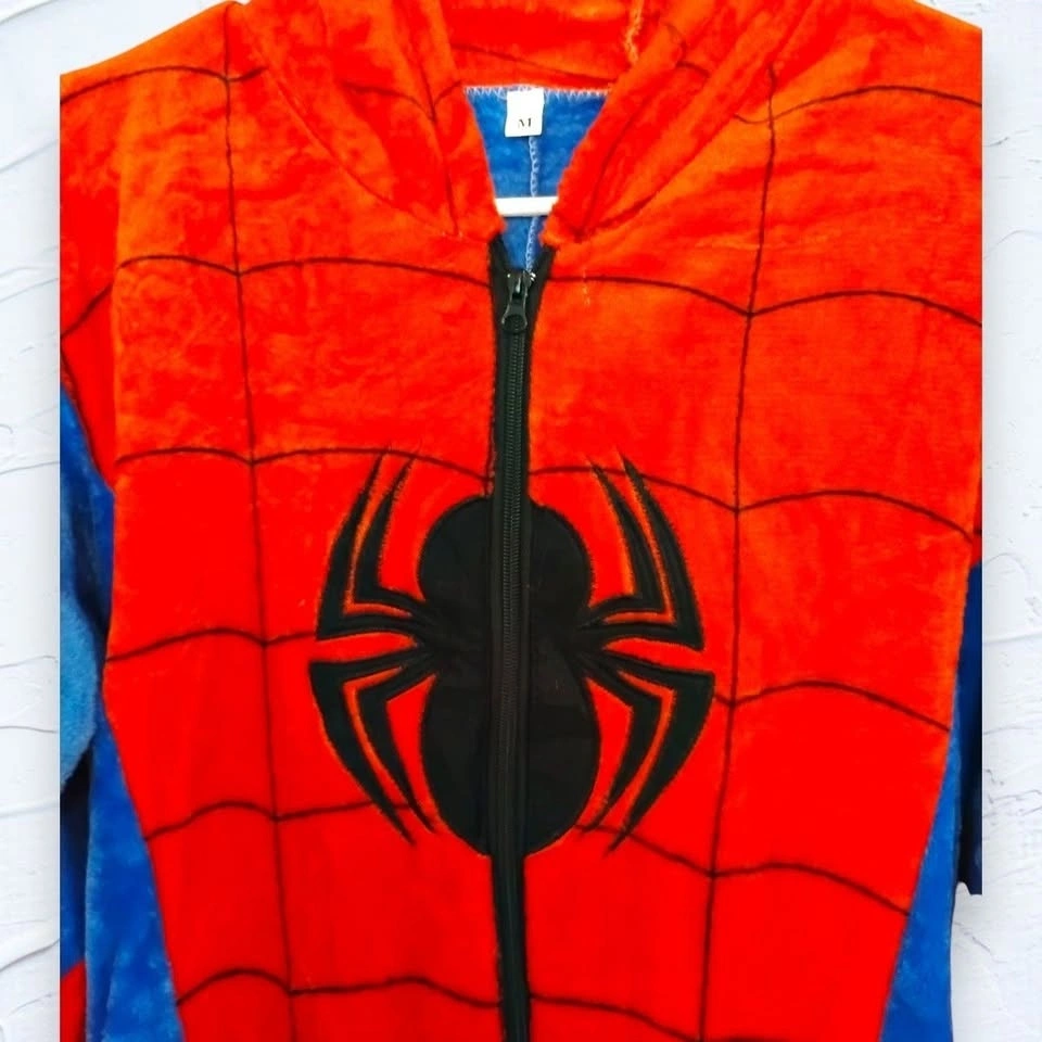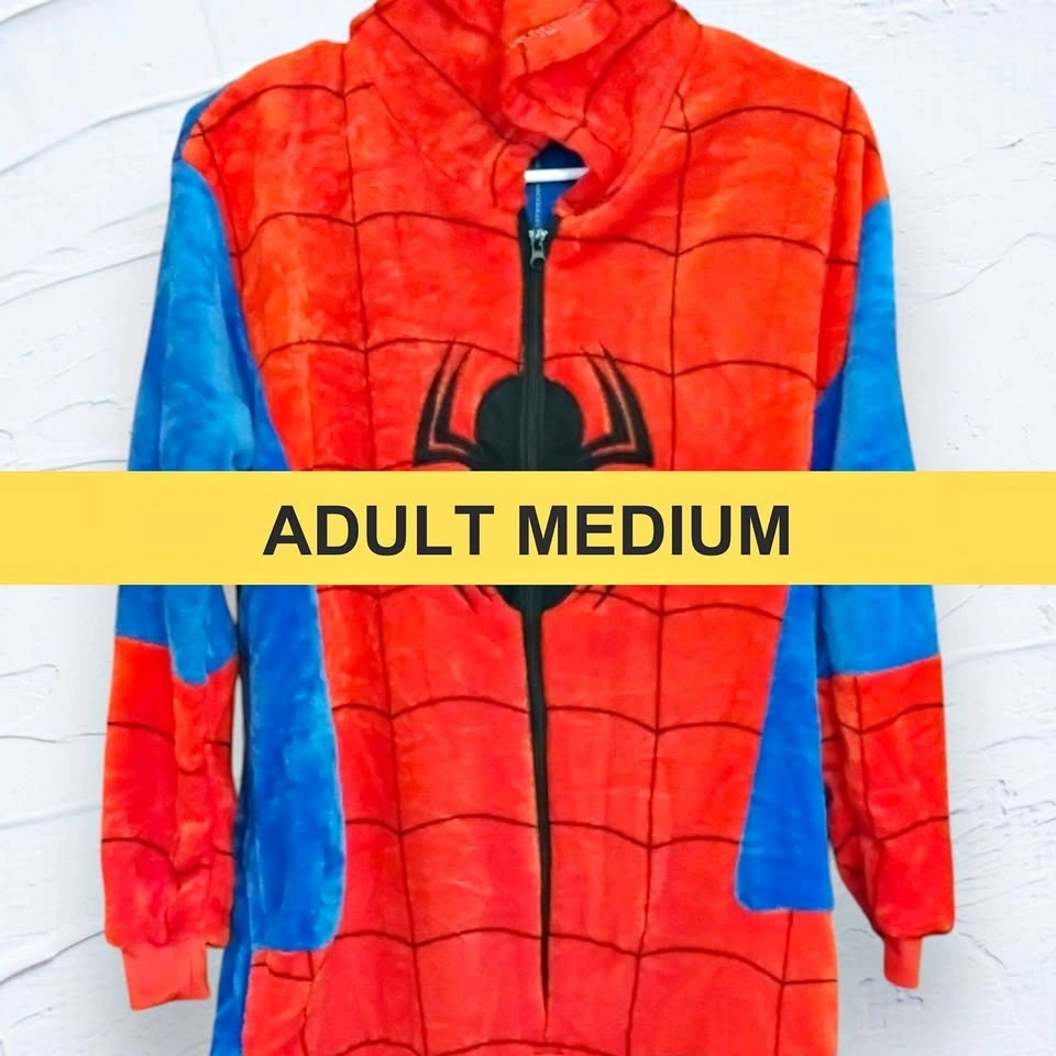 Super soft one piece union suit style hooded Spiderman pajama set/ costume. Size Adult Medium. Cuffs at ankle and wrists. Front and horizontal rear zipper closure. Machine wash/line dry. This pre-owned item has been gently used with light wear from normal use. Smoke and pet free home.