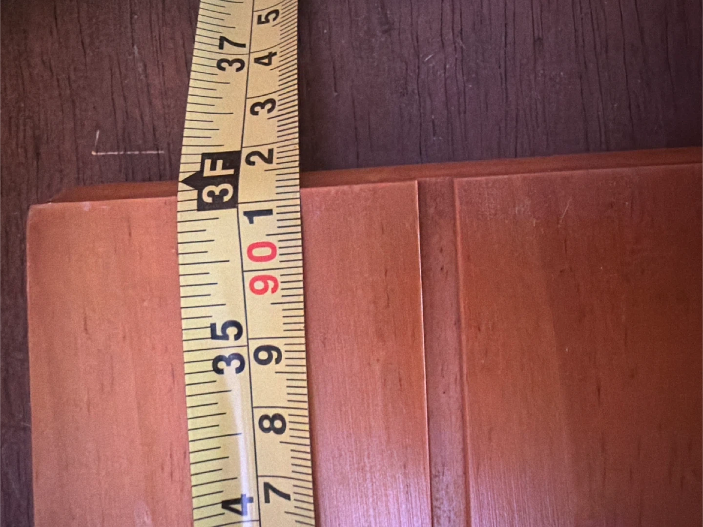 Two wooden floating shelves with four decorative triangular brackets. The shelf measures approximately 3 feet in length and 9 inches in depth. It's made of solid oak wood and comes disassembled with its mounting hardware included. This shelf is great for displaying decor or books! I used it in the kitchen for cookbooks and decorative plates and pieces.