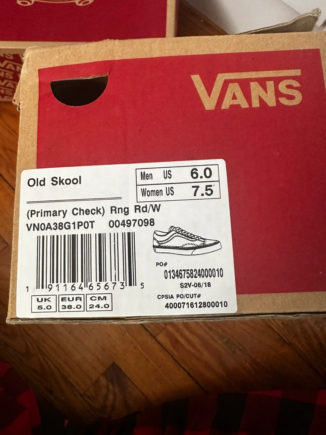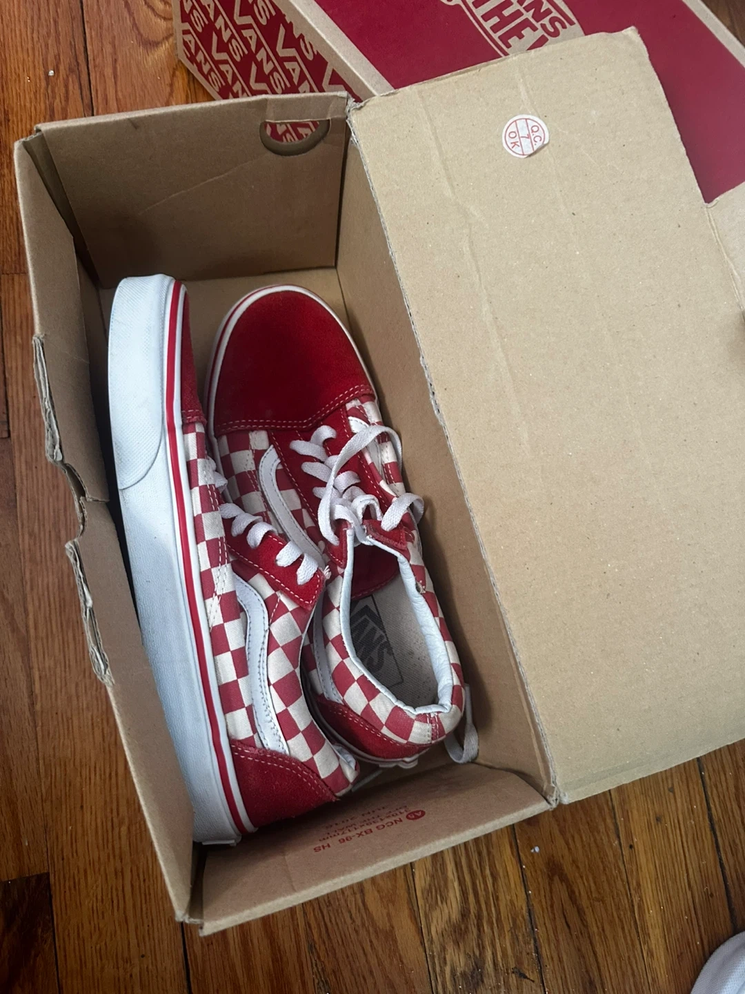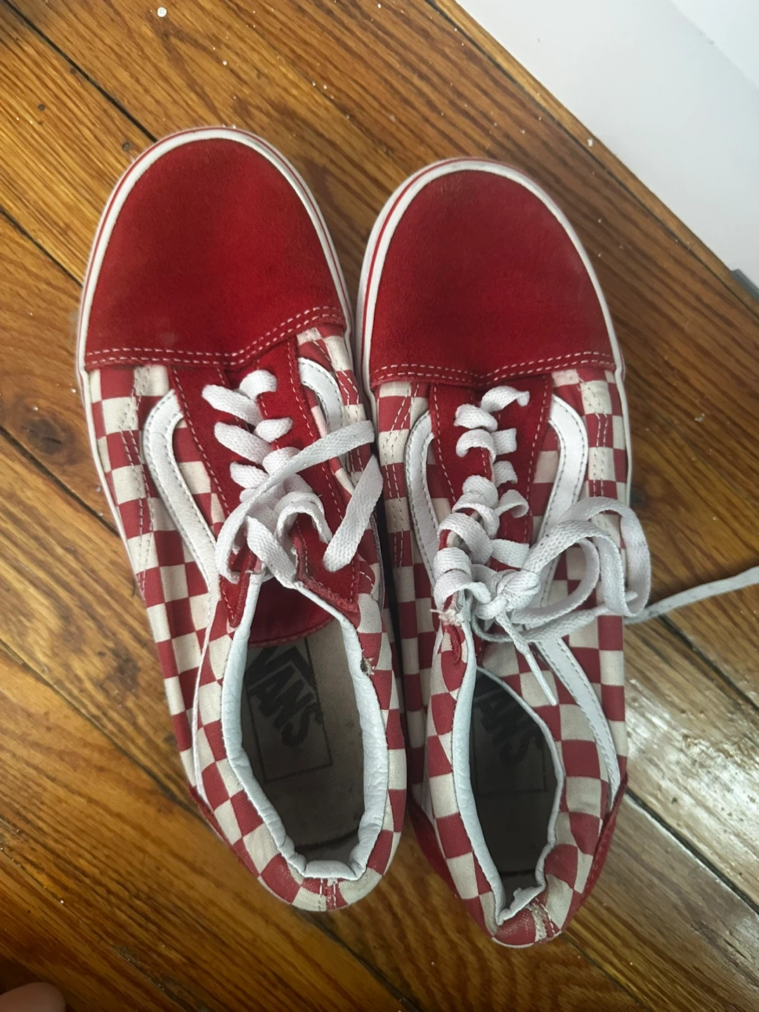 Selling a pair of Vans Old Skool sneakers in a red and white checkered pattern! These are men's size US 6. They come with the original box. Great for adding a pop of color to your outfit!