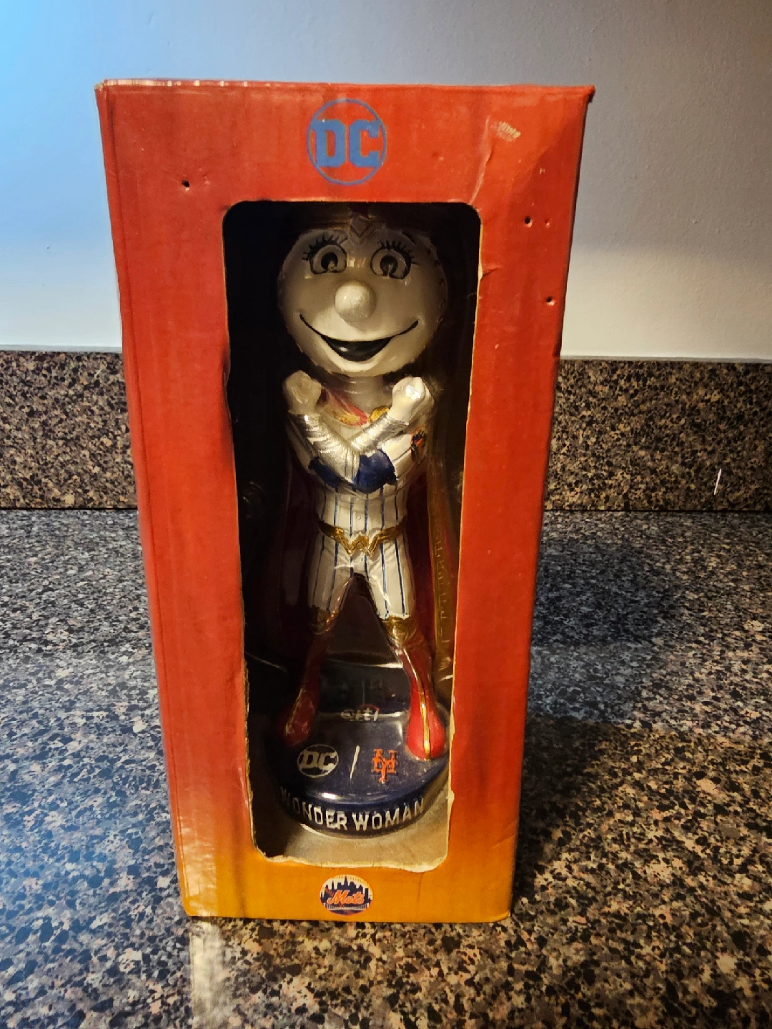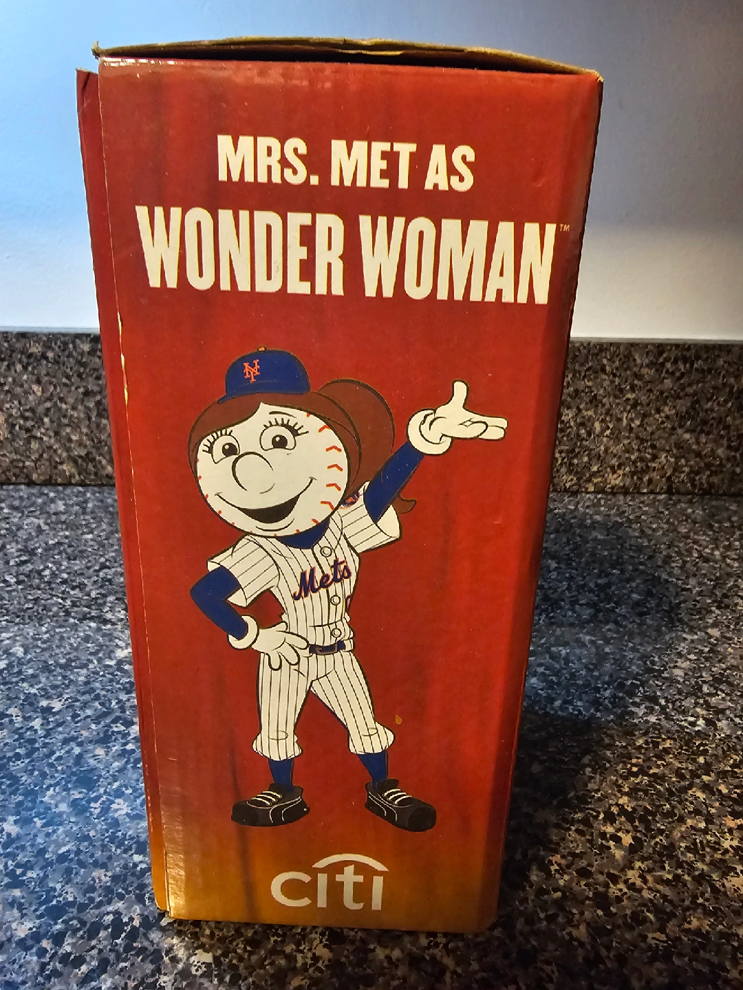 Selling a Mrs. Met as Wonder Woman bobblehead in its original box! This unique collectible features Mrs. Met dressed as Wonder Woman. A fun item for any Mets or DC Comics fan