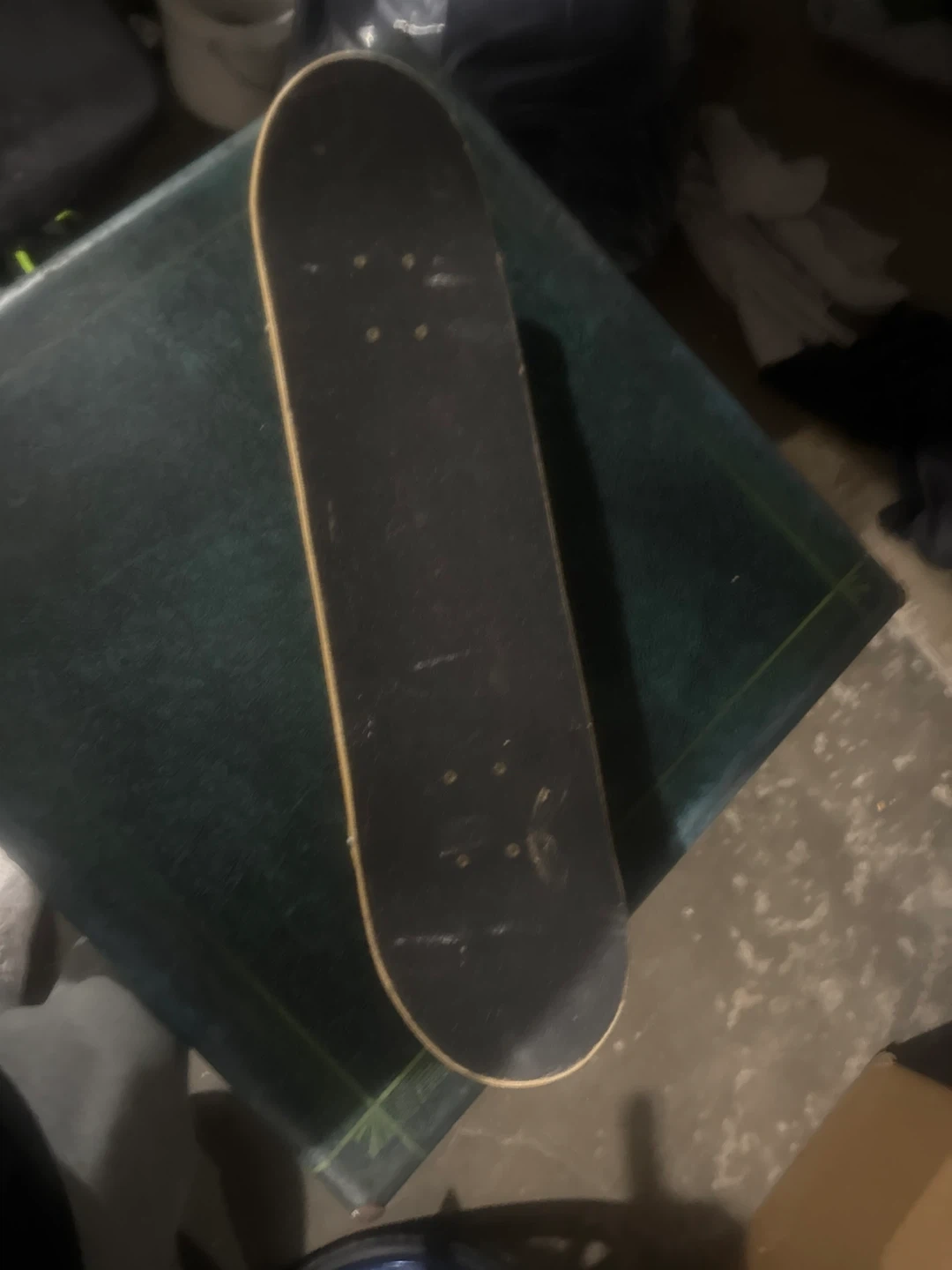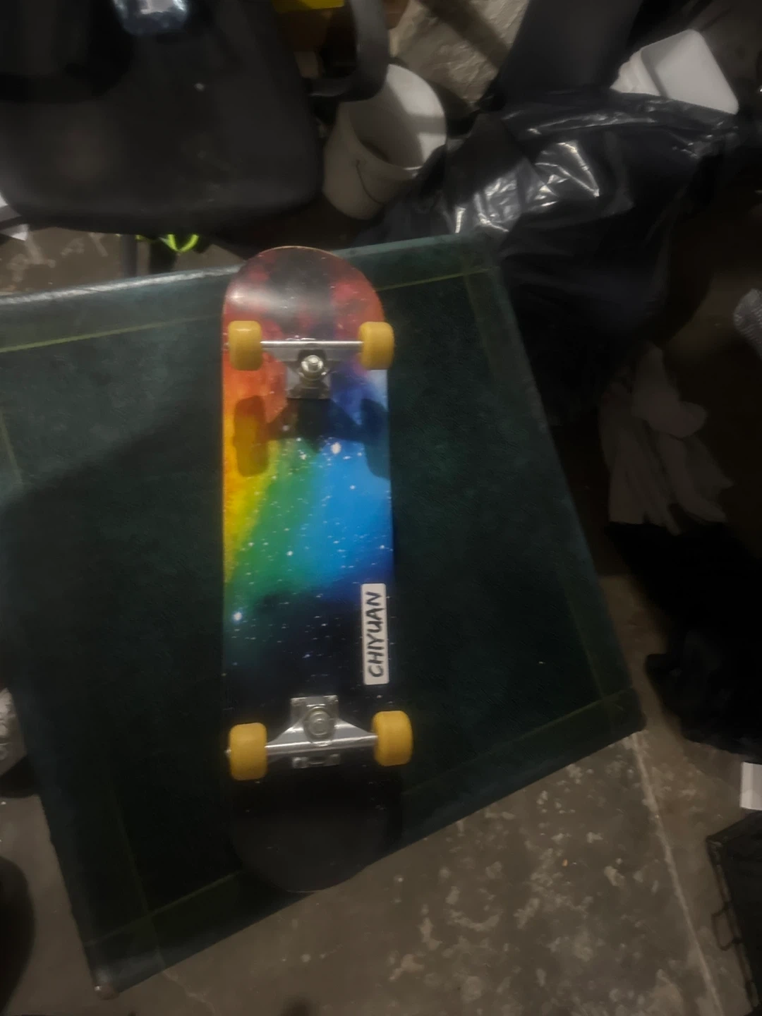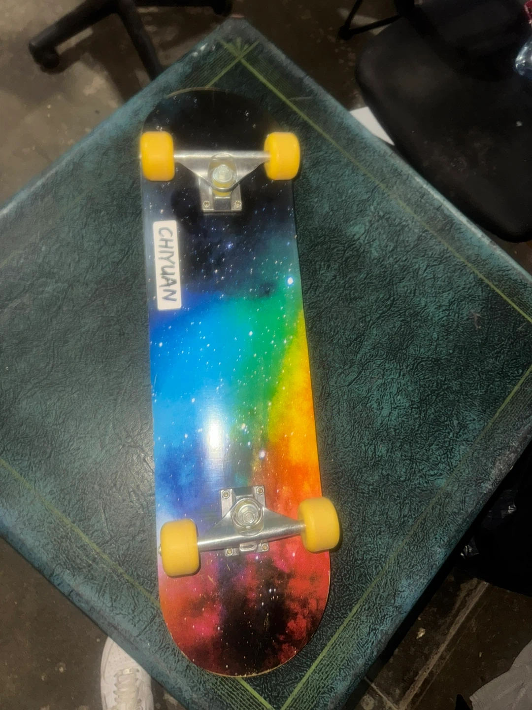 This is a CHYUAN brand mini skateboard. It features a vibrant galaxy and rainbow design on the deck. The skateboard has yellow wheels and standard metal trucks. Perfect for beginners or for tricks!