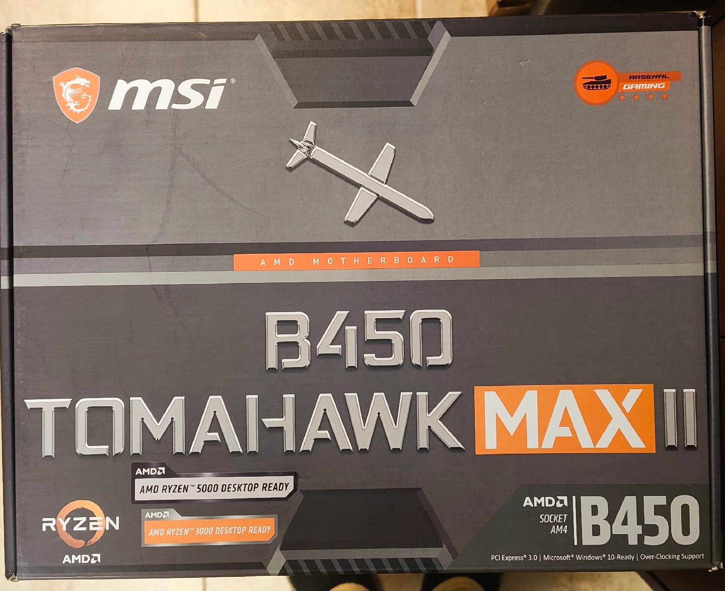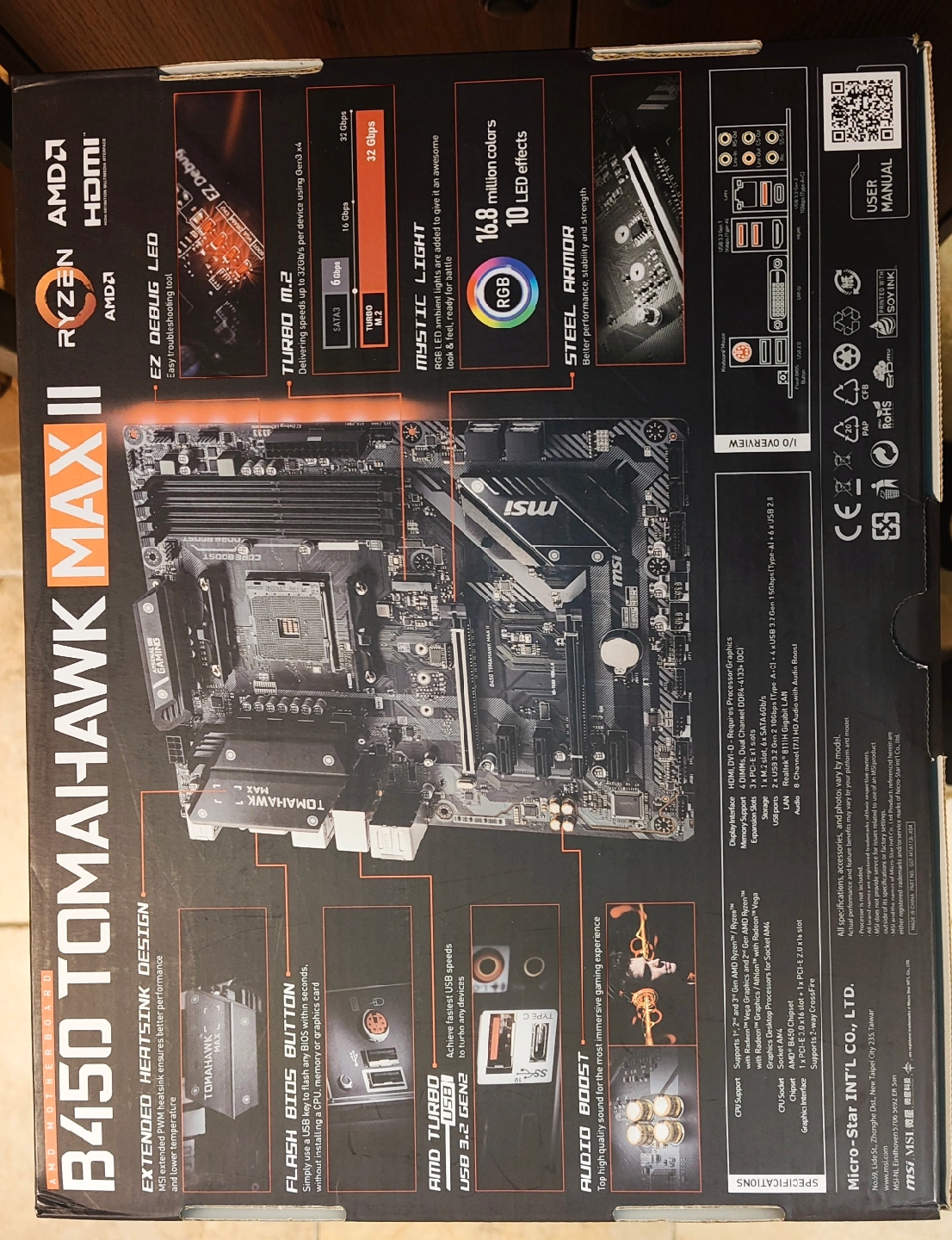 Selling an MSI B450 Tomahawk MAX II AMD Motherboard. It comes with Extended Heatsink Design, EZ Debug LED, Turbo M.2, Mystic Light RGB, and Steel Armor. The motherboard supports AMD Ryzen 5000 desktop and AMD Ryzen 3000 desktop processors. It also features Flash BIOS Button for easy BIOS flashing. The box is included
