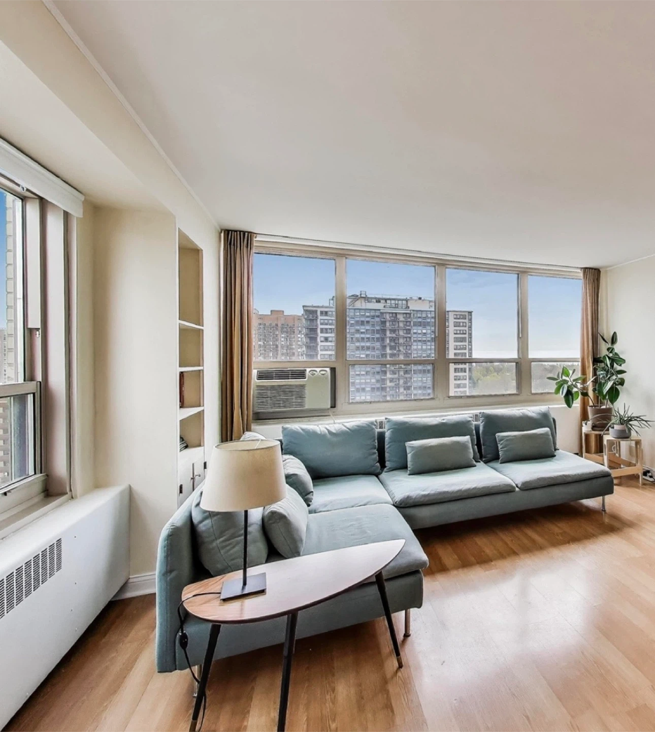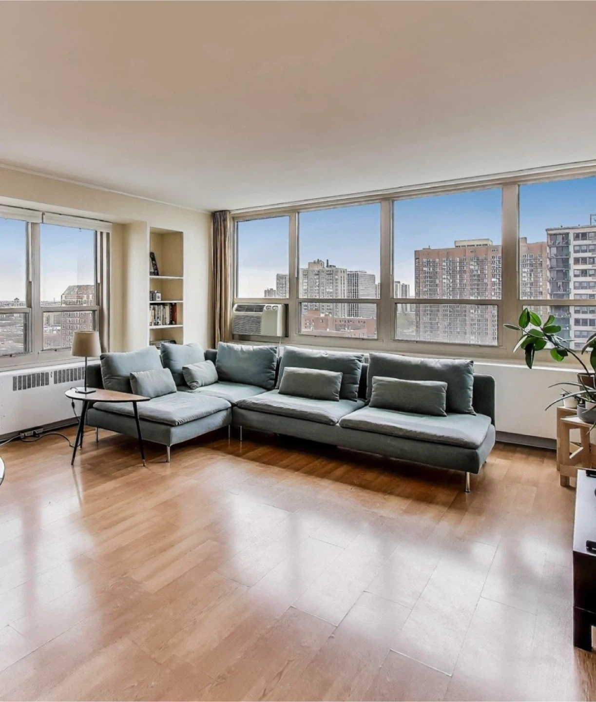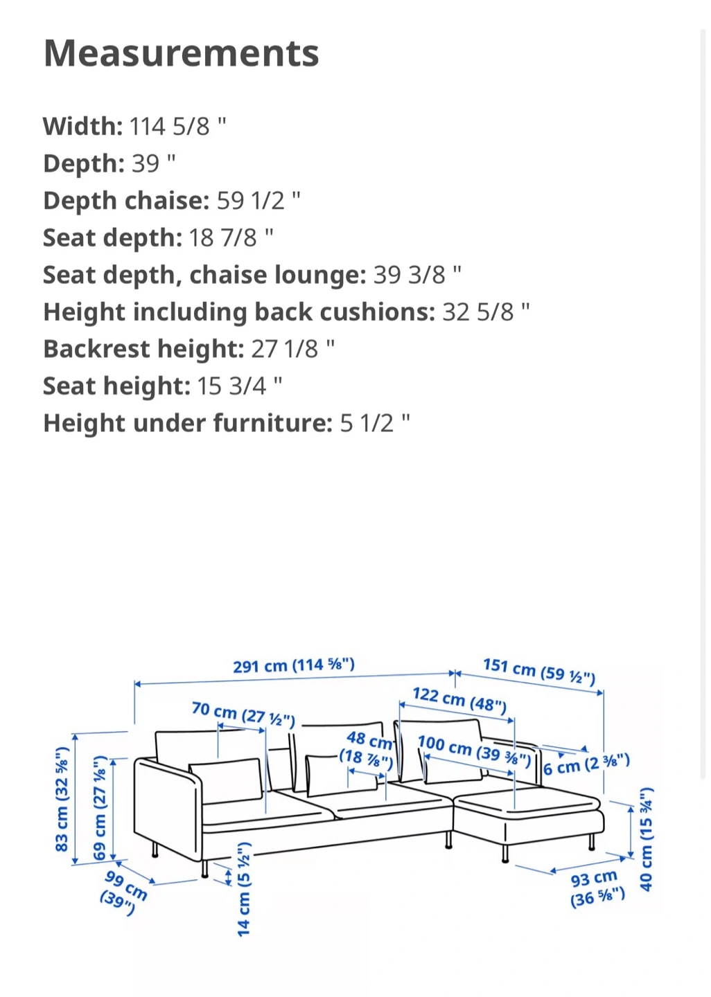 This is an IKEA SÖDERHAMN sectional sofa with a chaise lounge, upholstered in Kelinge gray-turquoise fabric. It's a 4-seat configuration designed for comfortable seating. Dimensions include a width of 114 5/8" and a depth of 39". This sofa provides ample seating space for a living room.