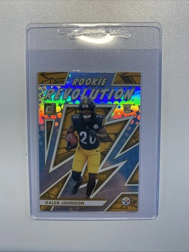 This is a 2025 Panini Donruss Kaleb Johnson ROOKIE Revolution card, number 19, featuring the Pittsburgh Steelers. Let me know if you're interested!