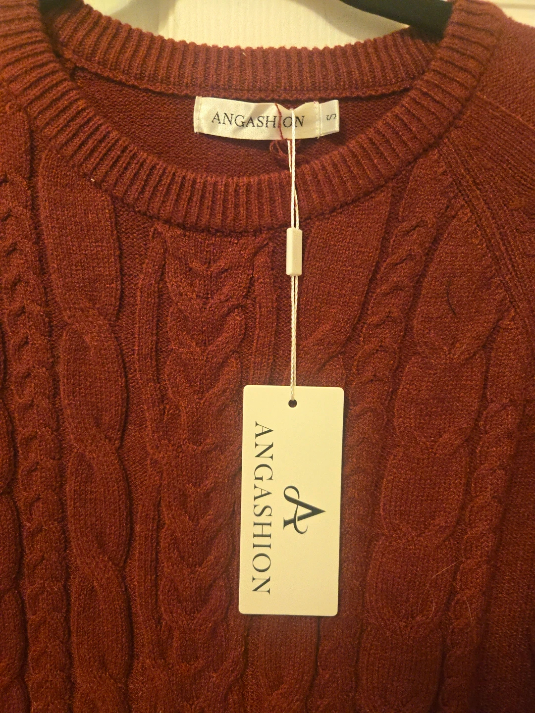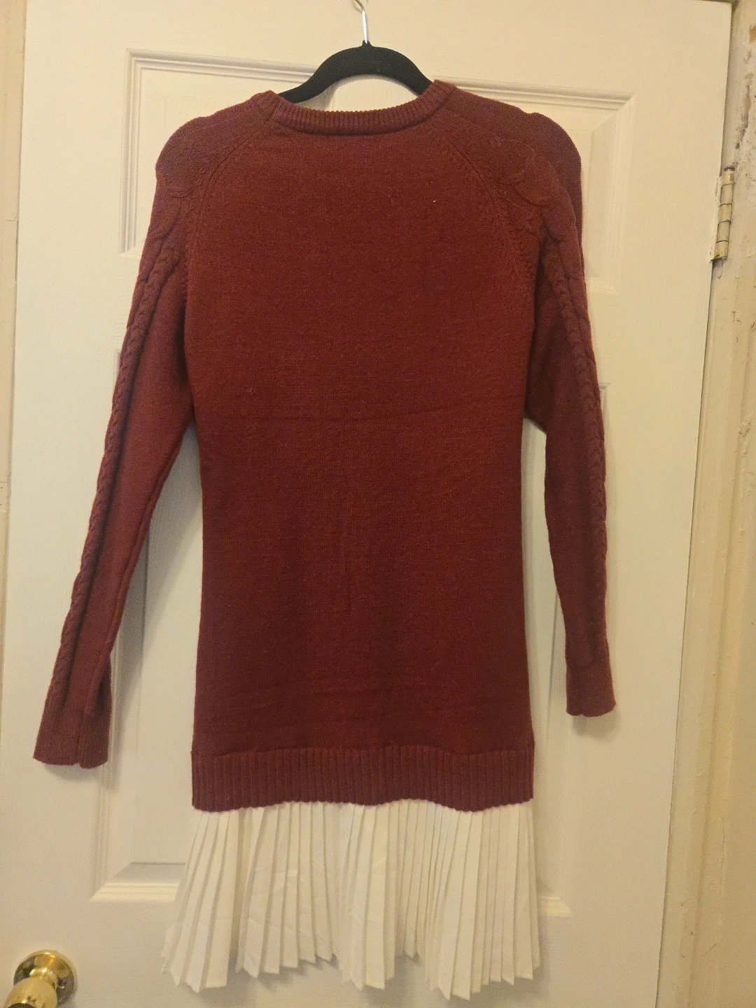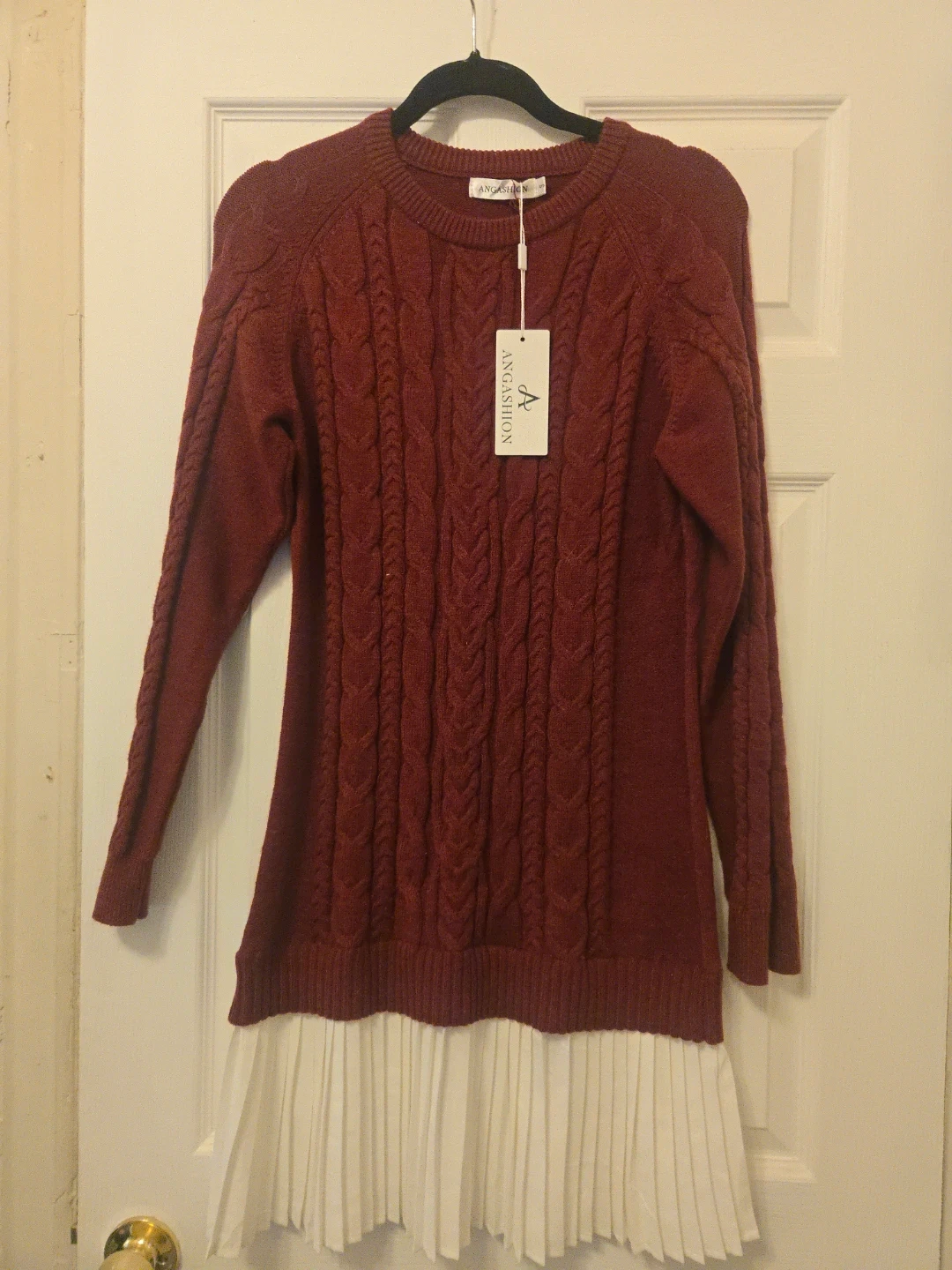 This ANGASHION sweater dress features a burgundy cable knit bodice with long sleeves. It has a pleated white skirt bottom. Size is small. Length is 36 NWT
