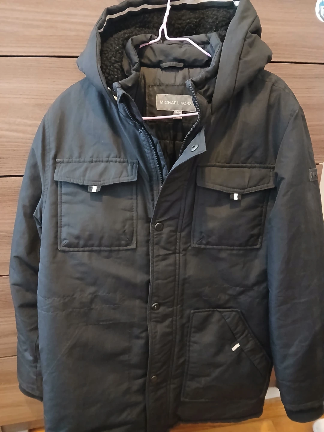 This is a black Michael Kors winter parka jacket. It features a hooded design with a sherpa-lined hood. Two chest pockets and one
