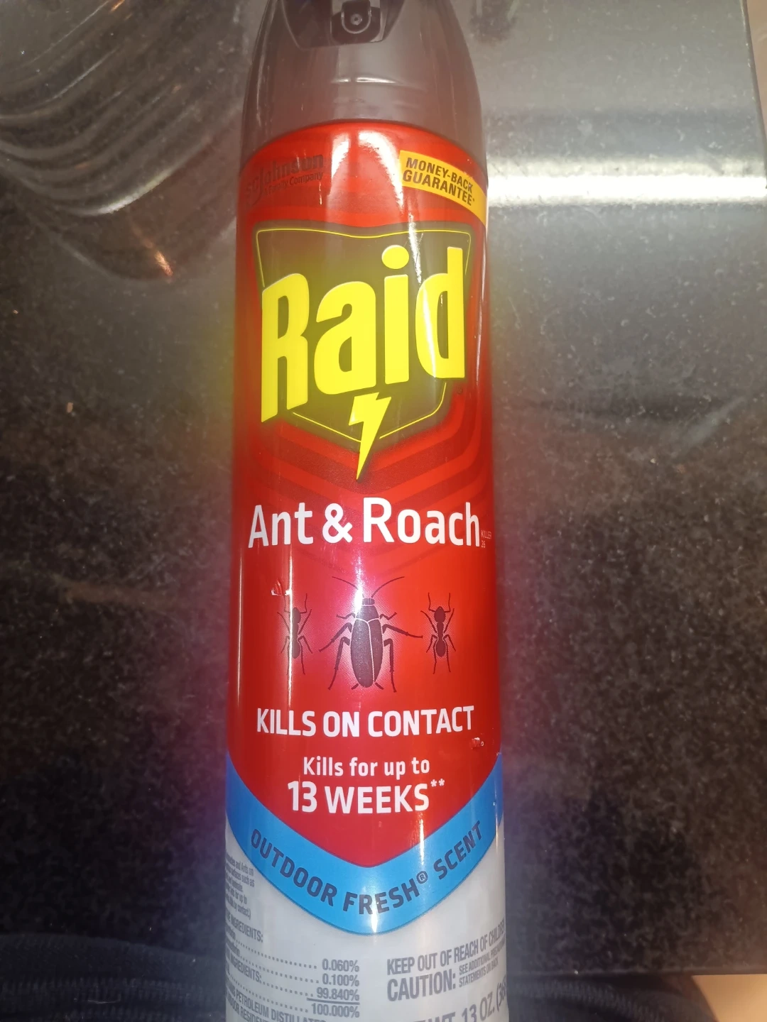 This Raid Ant & Roach killer spray is for outdoor fresh scent. It kills on contact and works for up to 13 weeks. It's a 13 oz can.