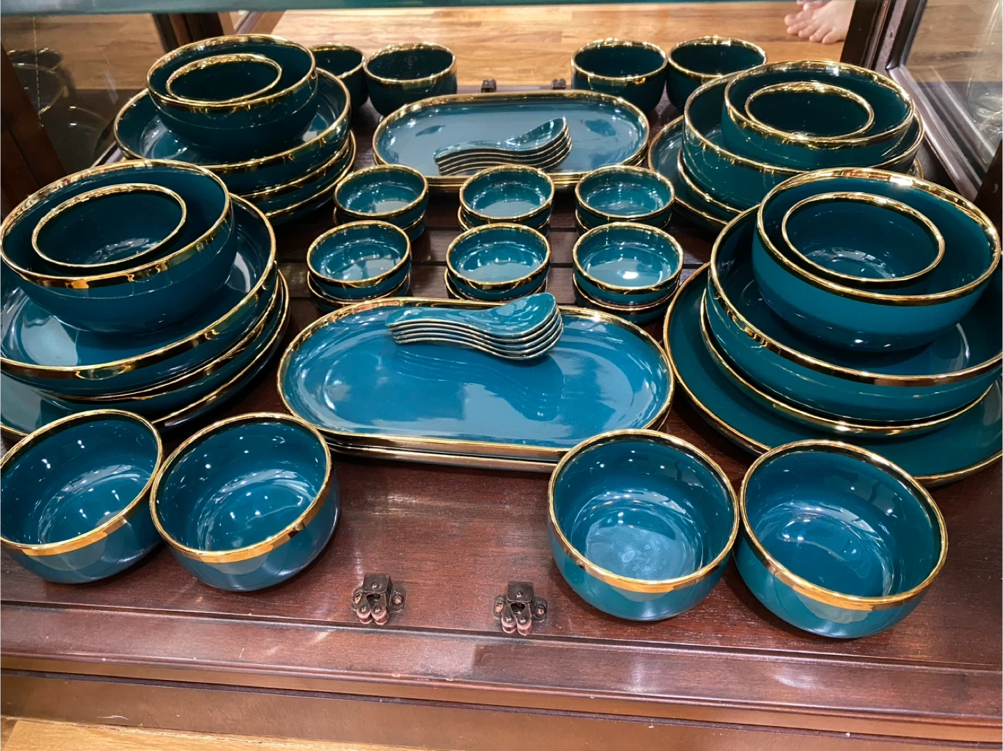 A complete set of teal ceramic bowls and plates with gold trim. Includes multiple sizes of bowls and serving dishes. This elegant dinnerware is perfect for special occasions or everyday use!