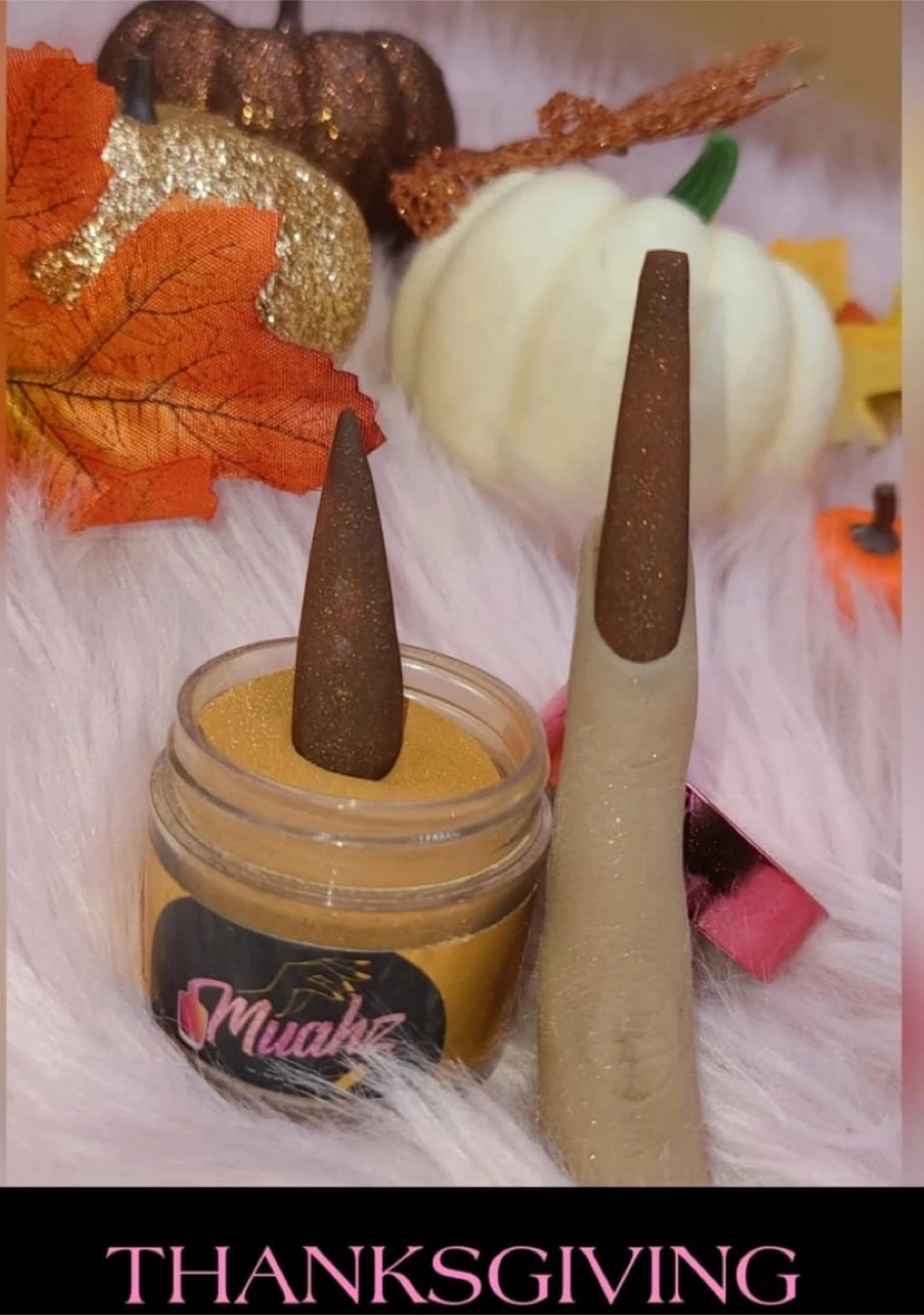 Selling a nail powder from Muahz, perfect for Thanksgiving-themed nail art! The powder is a lovely gold color, and the cone adds a unique touch. 1.oz