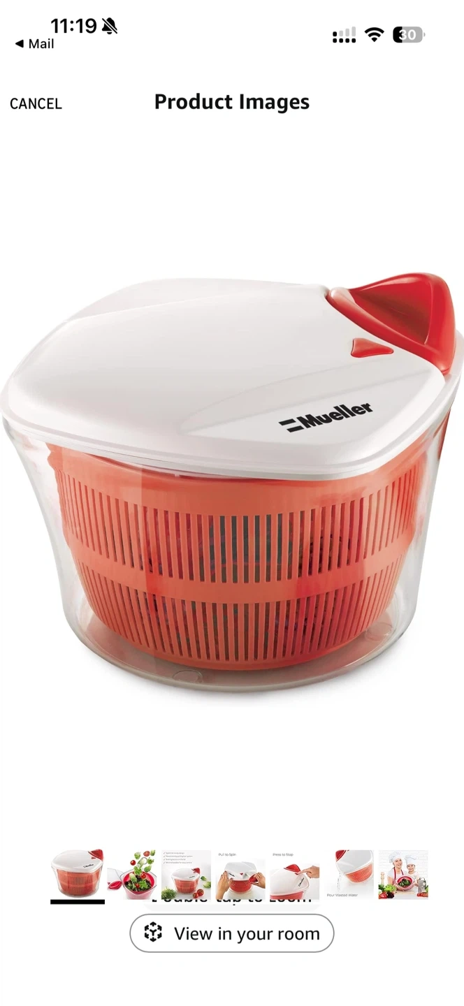 12I'm selling a Mueller salad spinner in excellent condition! It's white and red and ready to help you make some delicious salads. It is easy to spin and stop, and will help you make the best salads!