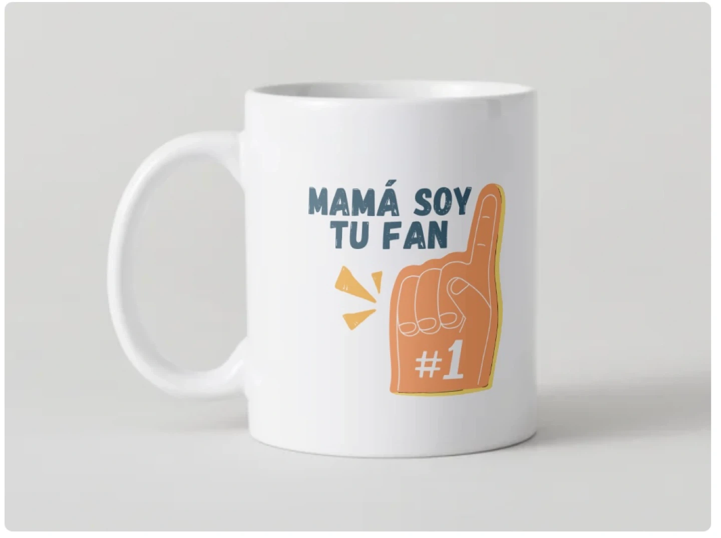 White mug with a design that says "Mama Soy Tu Fan" and an orange foam finger with #1 on it