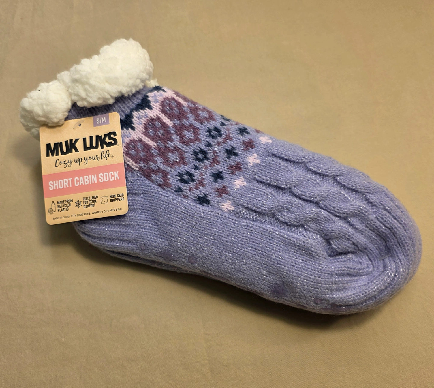 20Muk Luks cozy up your life short cabin sock in size S/M. It's fully lined for extra comfort and has non-skid grippers. Fits women's shoe sizes 5-7 and men's 5-6 Pick up in Naperville near naper blvd and 87th street or near downtown Naperville off of Chicago and Charles