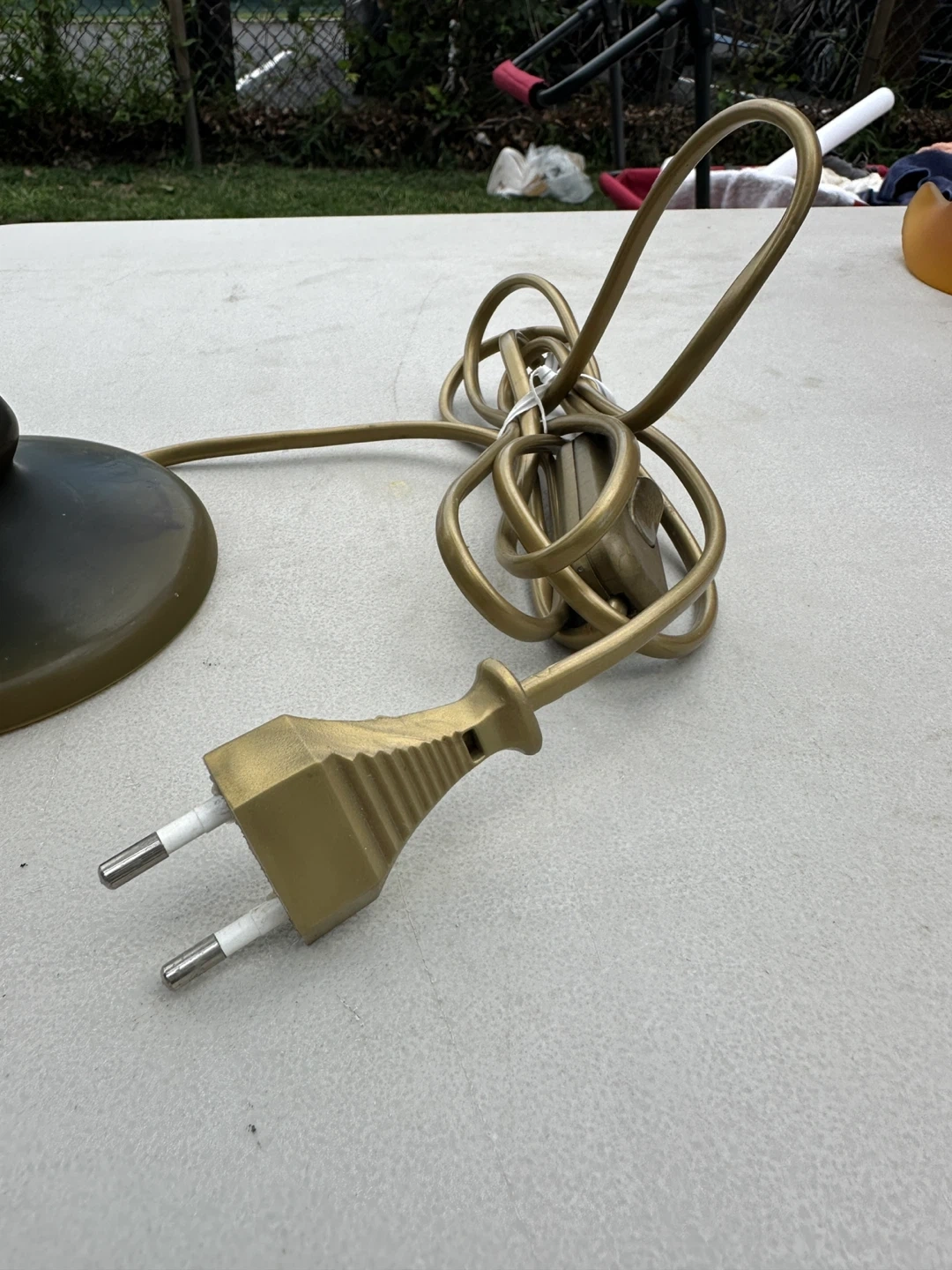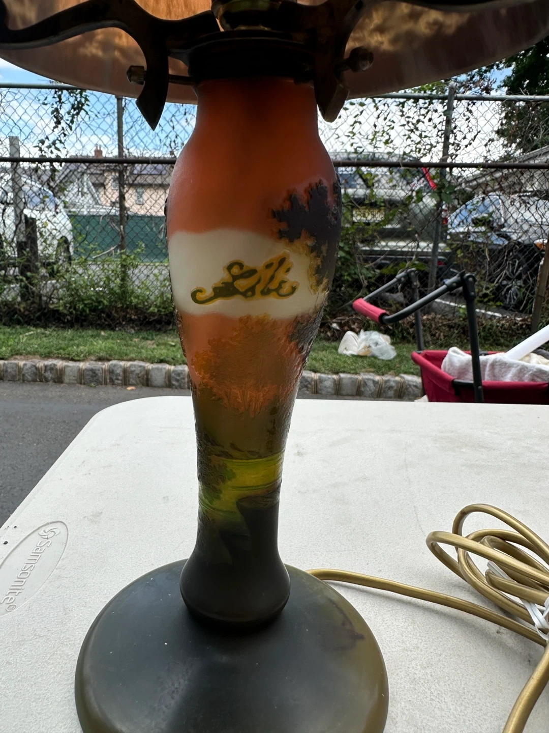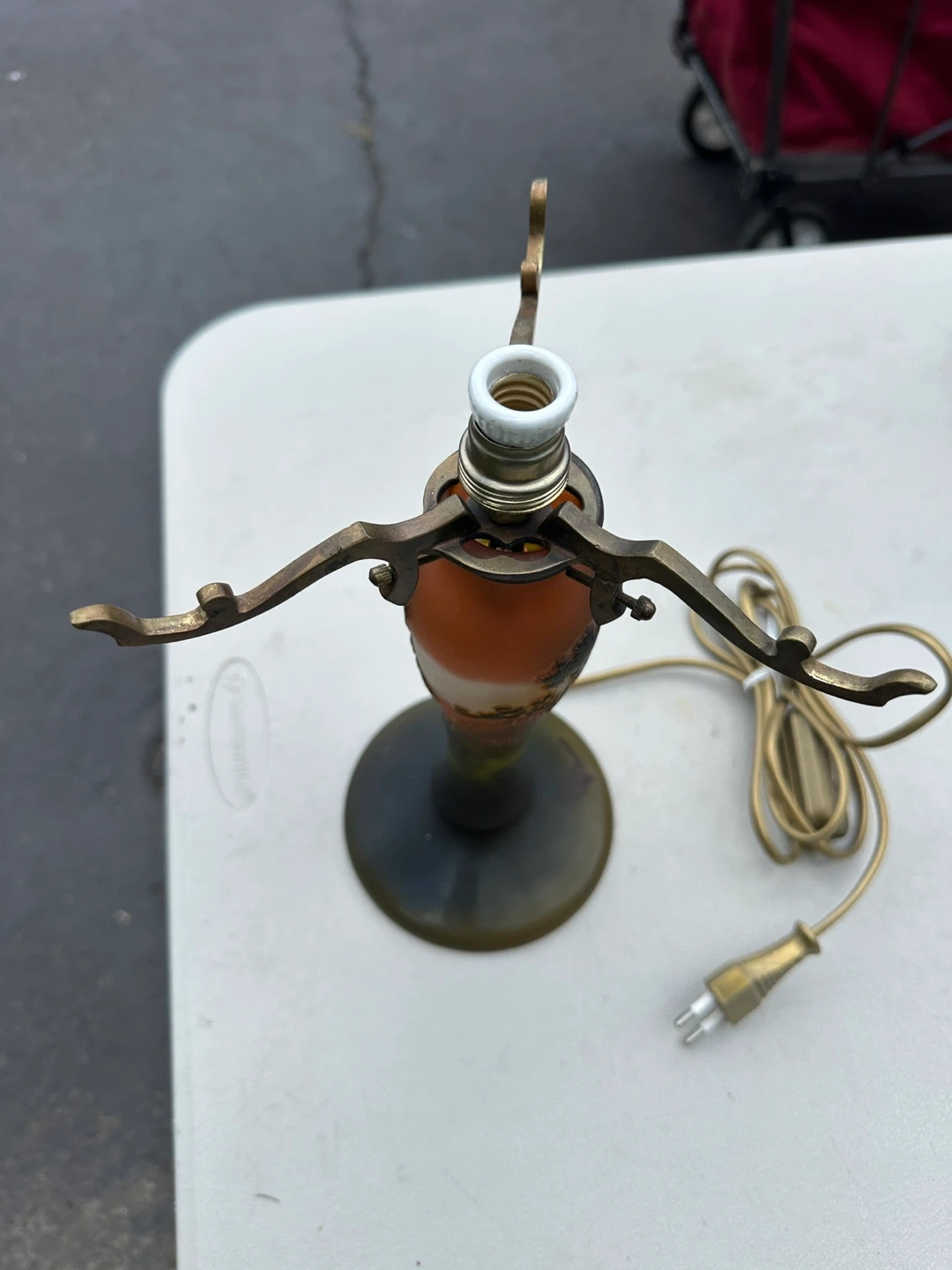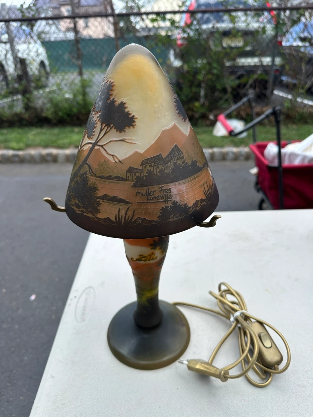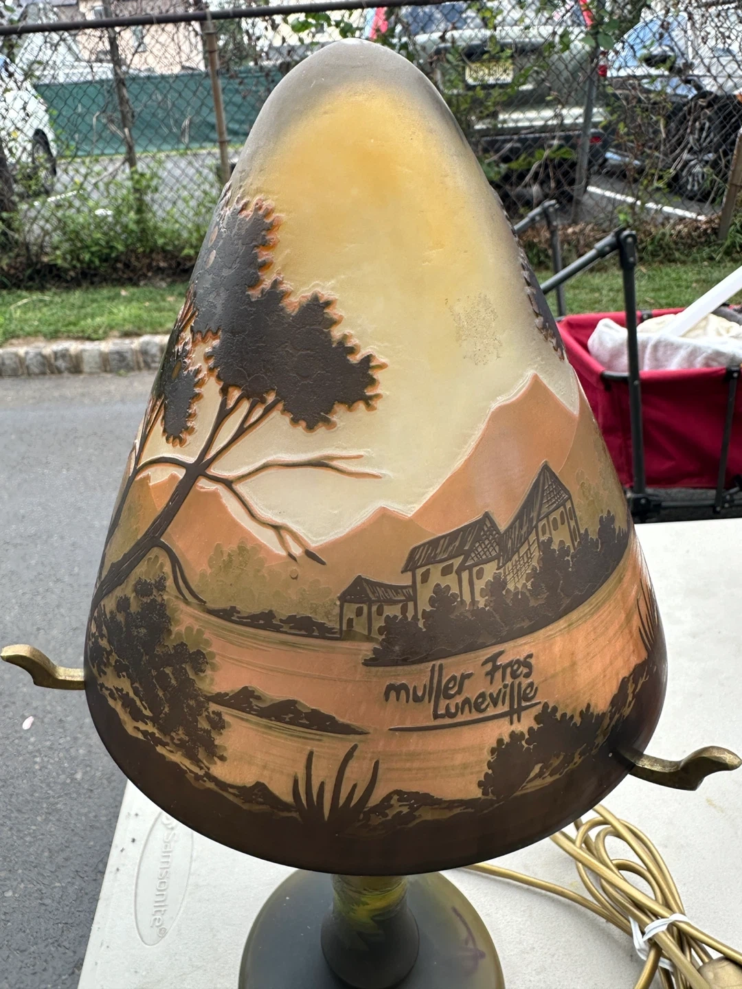 This is likely an antique or vintage boudoir lamp, possibly in the style of Muller Freres or similar Art Nouveau/Arts & Crafts glassmakers. Style: The lamp features a reverse-painted glass shade with a scenic countryside design, a common characteristic of boudoir lamps from the early 20th century. Potential Origin: The visible "Muller Fres Luneville" on the shade suggests it could be a piece by Muller Freres, a renowned French glass company. Age: Lamps of this style, particularly those with reverse-painted shades, often date back to the Victorian or early 20th-century eras. Collecting: These types of lamps are sought after by collectors of antique and vintage lighting, especially those interested in Art Nouveau or Arts & Crafts aesthetics.