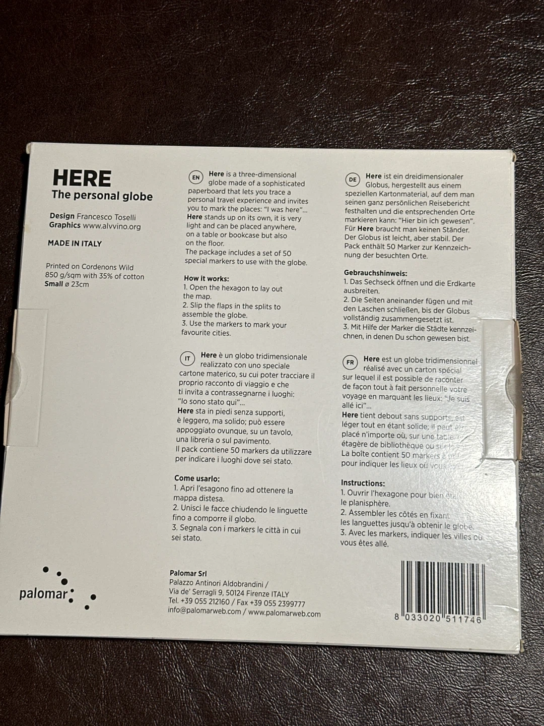 I'm selling a HERE The Personal Globe. It's a three-dimensional globe made of a sophisticated paper that lets you trace a personal travel experience and invites you to mark the places. The package includes a set of 50 special markers to use with the globe