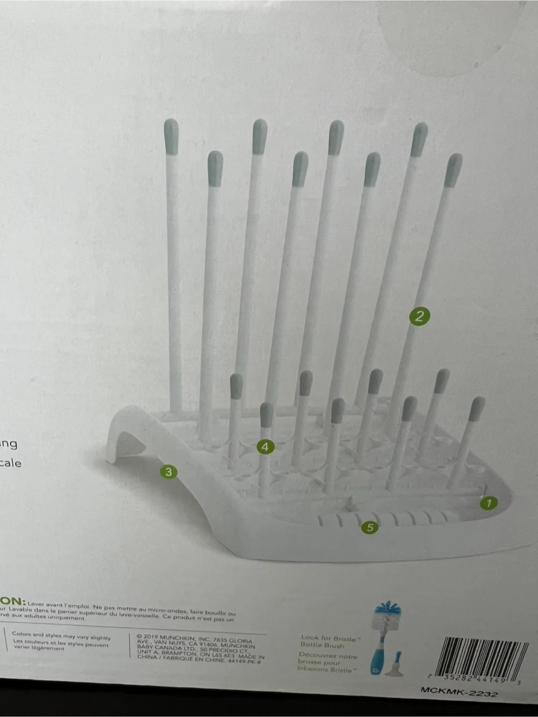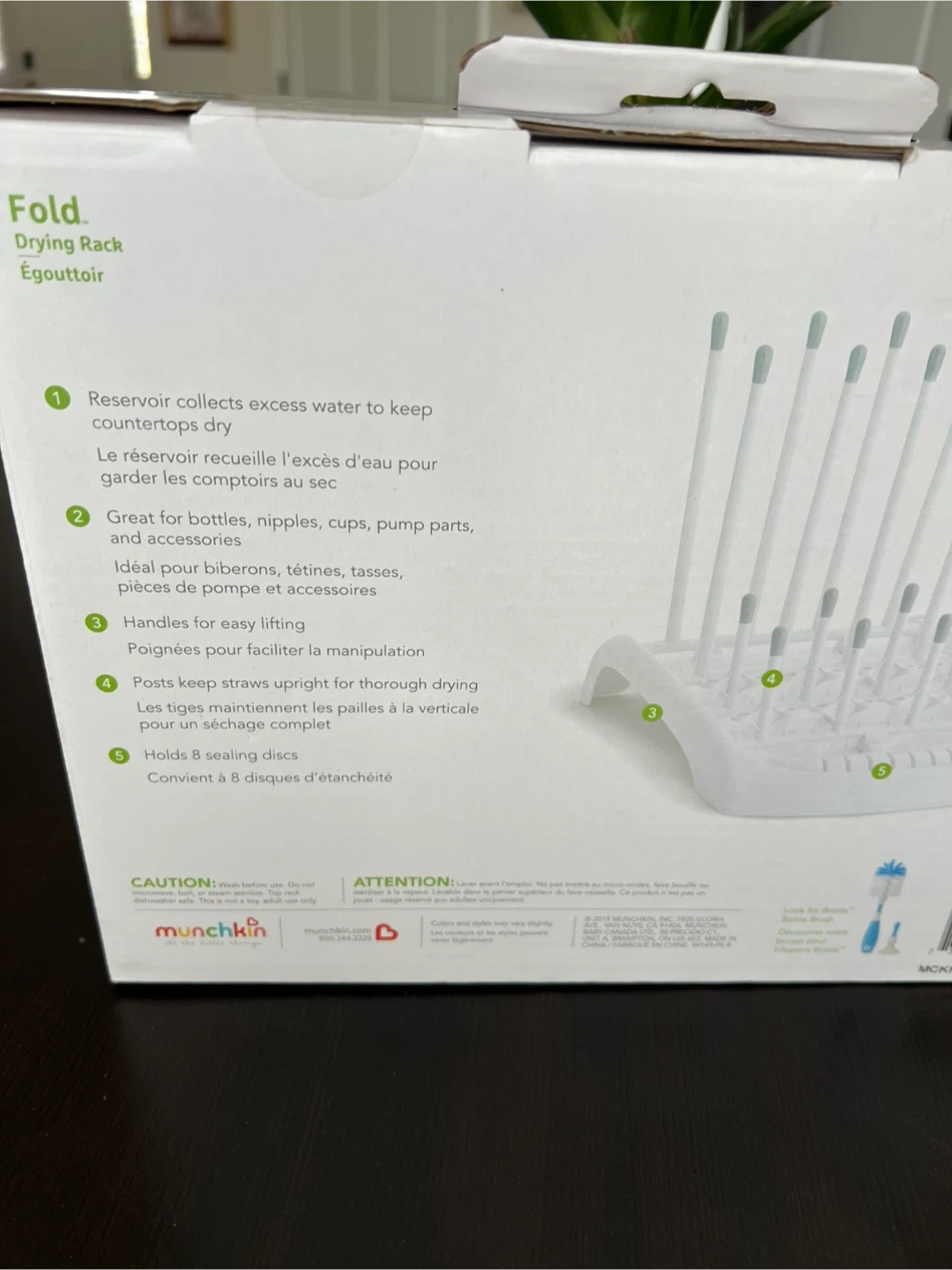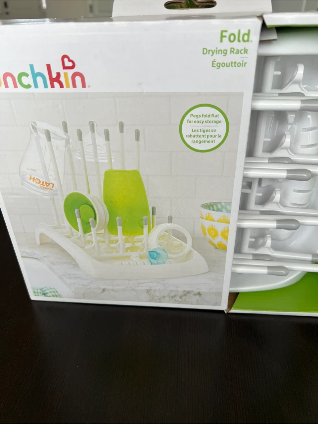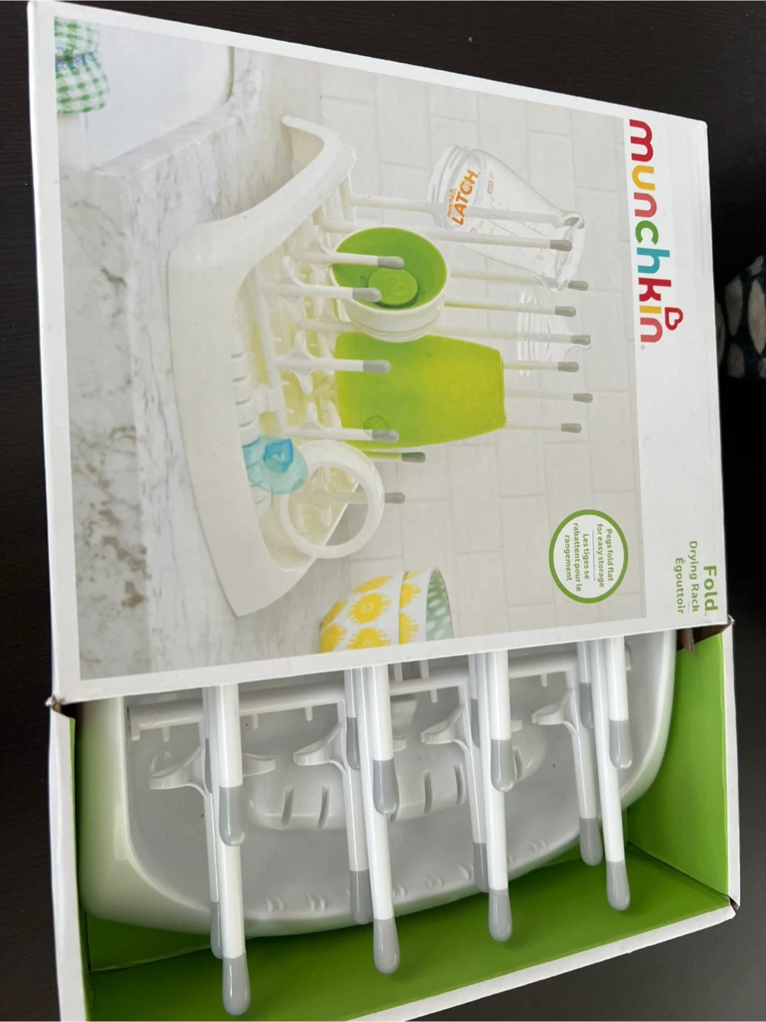 10Selling a Munchkin Fold Drying Rack! It's great for bottles, nipples, cups, pump parts, and accessories. The reservoir collects excess water to keep countertops dry, and it has handles for easy lifting. The rack also holds 8 sealing discs and the posts keep straws upright for thorough drying