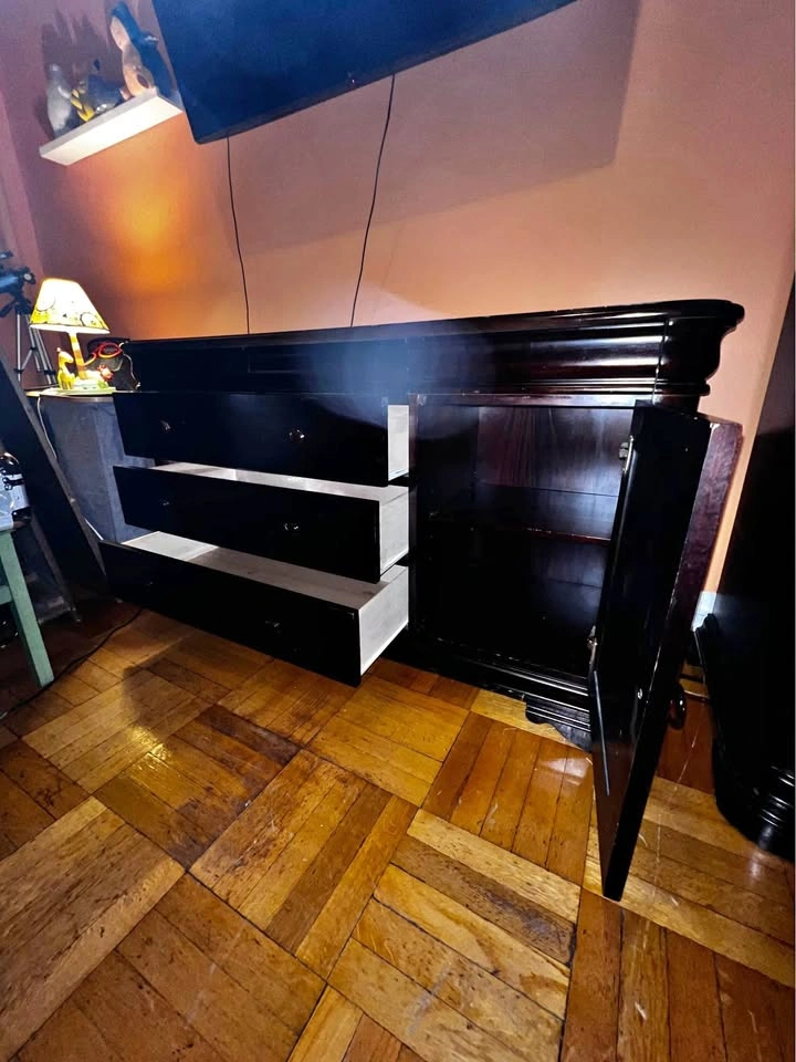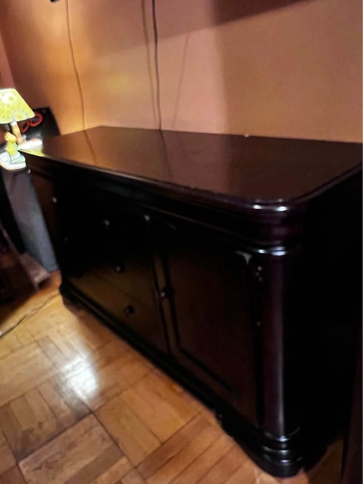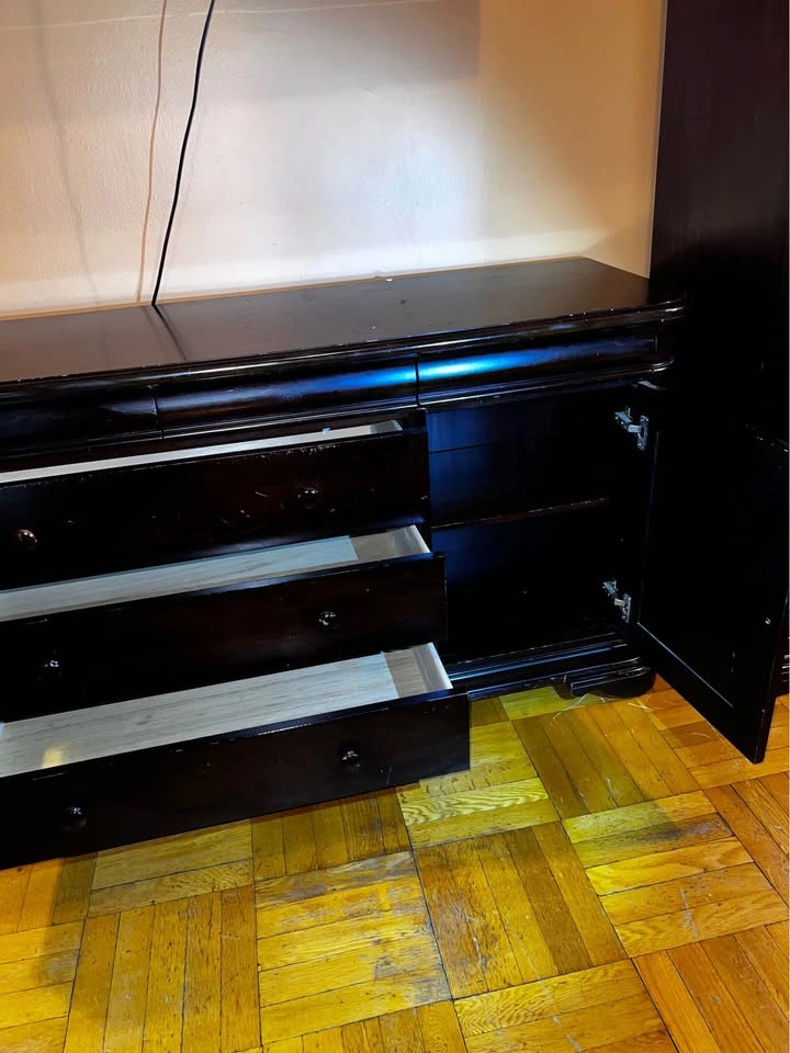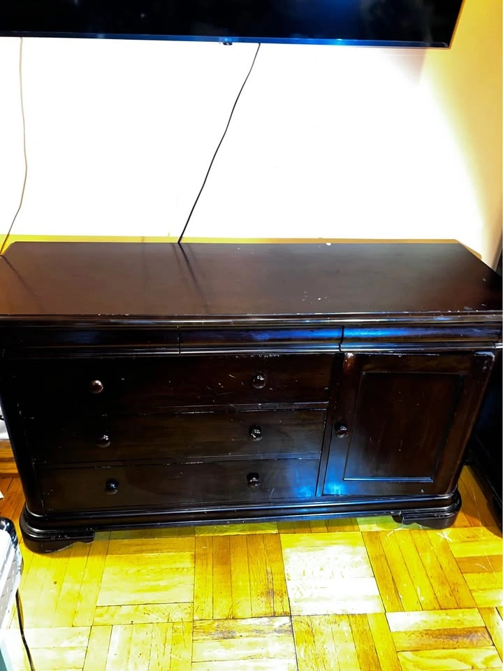 3 drawer dresser with cabinet door and open storage. Dark brown solid wood. Dimensions: 59 1/2” wide x 34 1/2” tall x 20” deep. Really strong and durable. Has so much more life in it; just may need a bit of love on the surface - cosmetic scratches. It is heavy. You will need at least 2 people to lift and carry. Pick up from 3rd floor with elevator.