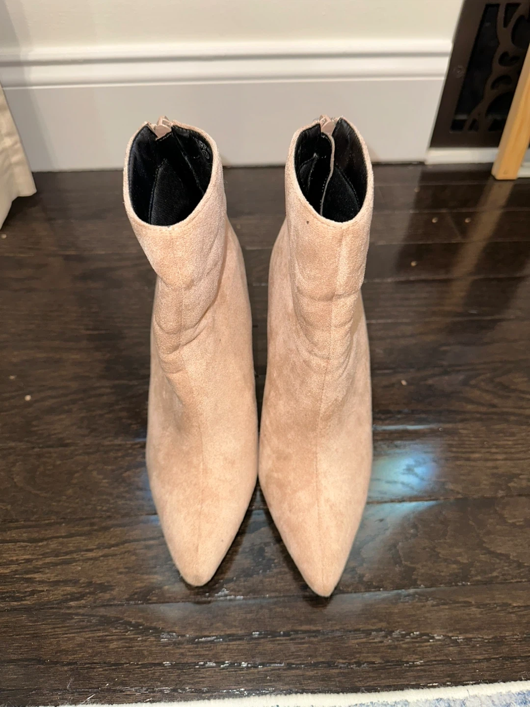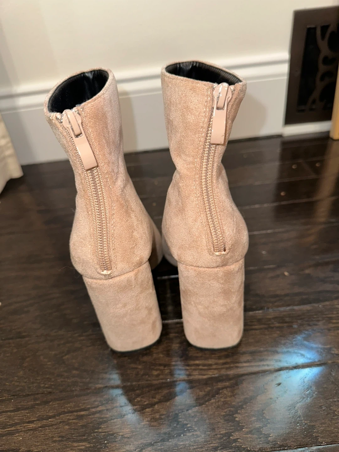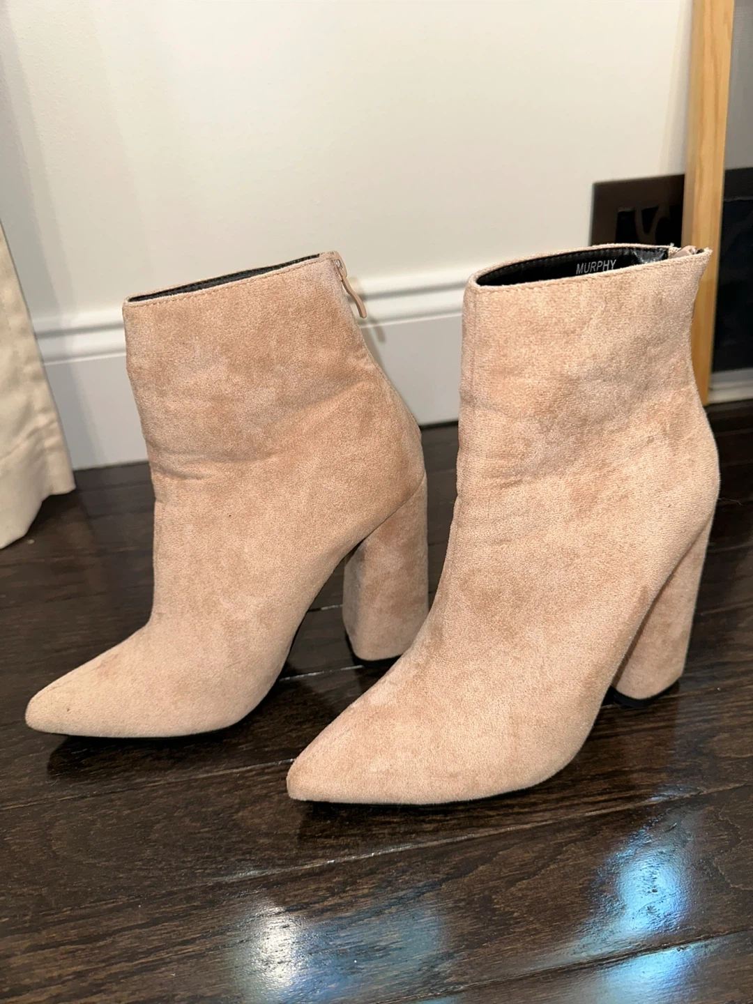Selling a pair of MURPHY block heel booties. Lightly worn. They are a light tan or beige color with a pinky tint and have a zipper in the back.