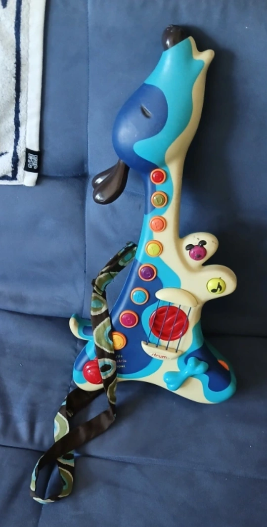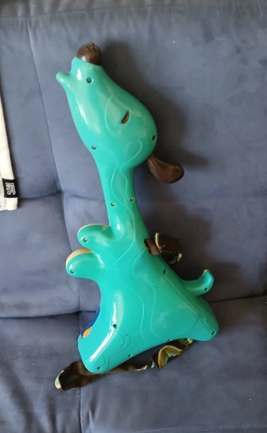 This is a musical toy guitar in the shape of a dog with buttons to play different sounds and melodies.