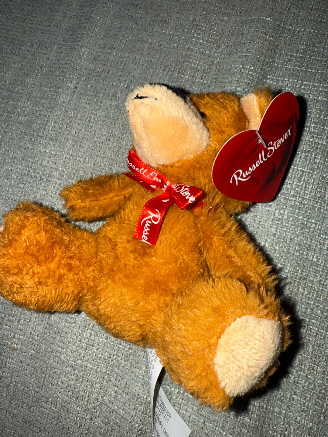 I’m giving away a small, fuzzy teddy bear designed and manufactured for Russell Stover Chocolates. It's made of polyester fibers and wears a red ribbon with the Russell Stover logo. It's a collectible item. Smoke free home.