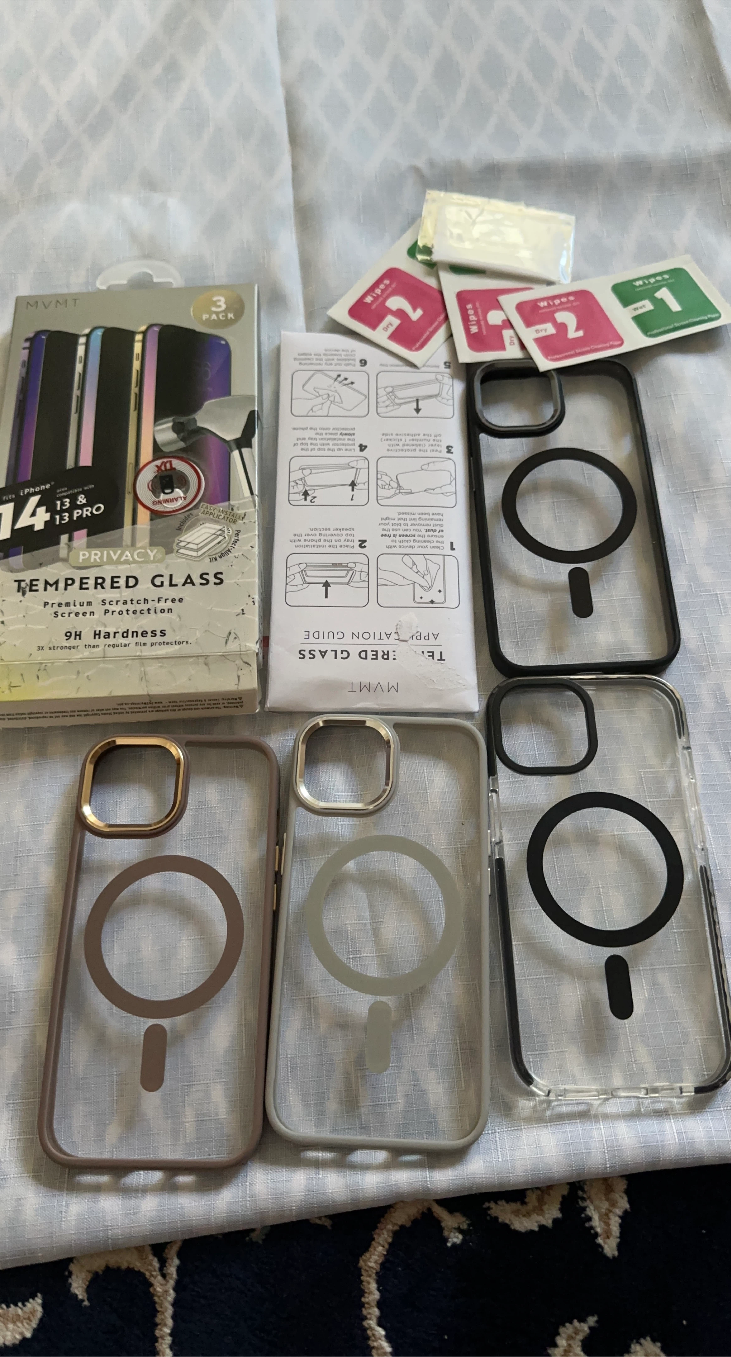 Selling a set of MVMT phone accessories! This includes: - 3-pack of privacy tempered glass screen protectors for iPhone 13 & 13 Pro/14 - Application guide for the tempered glass - Cleaning wipes - 3 phone cases with MagSafe compatibility