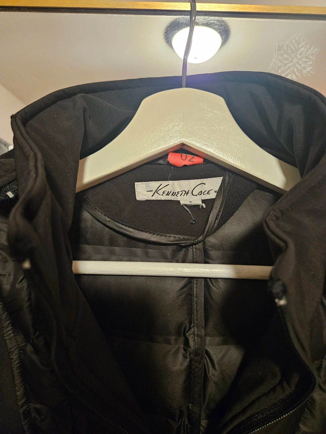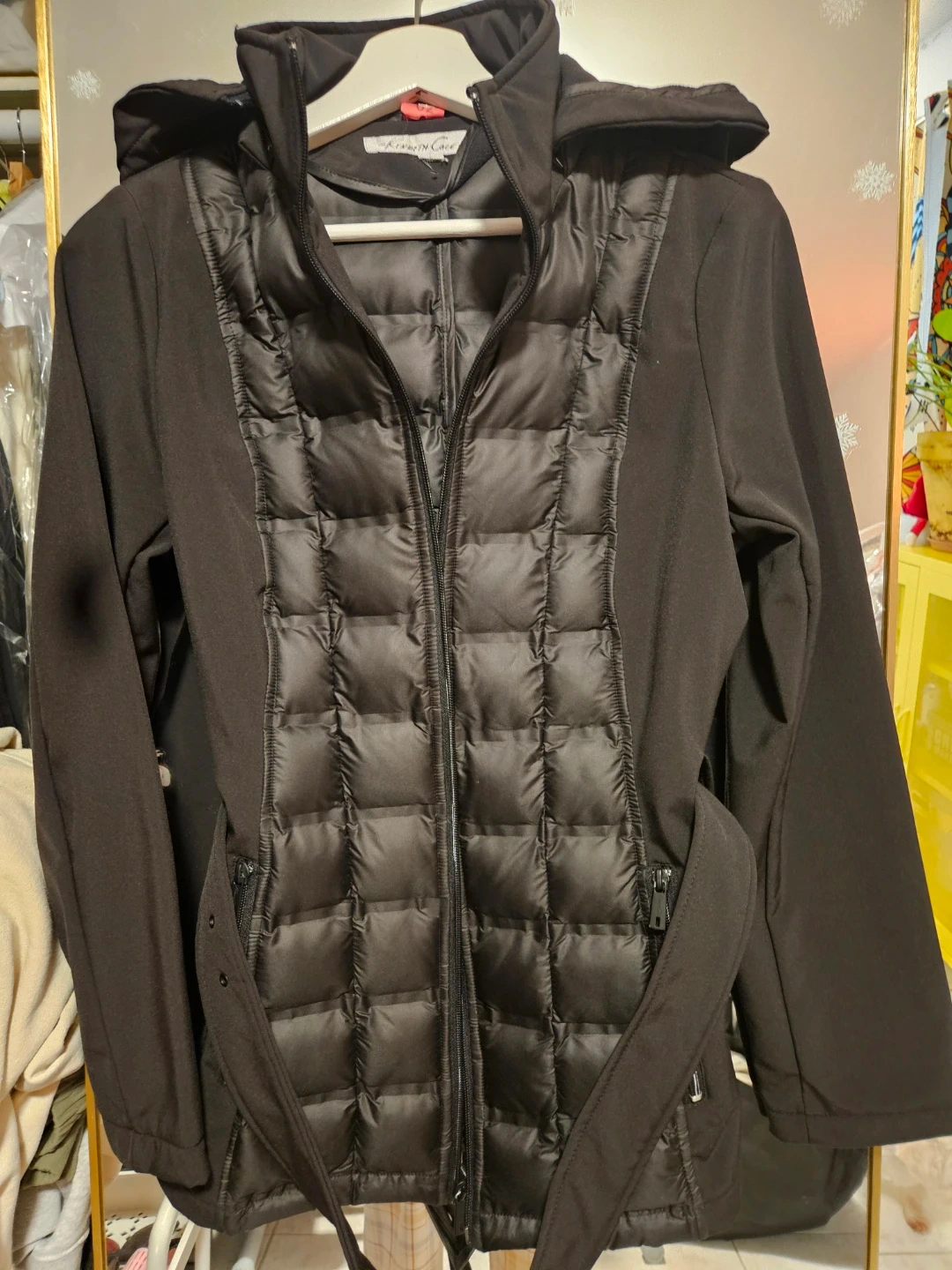 Here's a Kenneth Cole black hooded puffer jacket! It's a stylish and warm piece, perfect for cooler weather. The jacket features a quilted puffer design on the front and a comfortable hood. It also has a belt to cinch the waist.