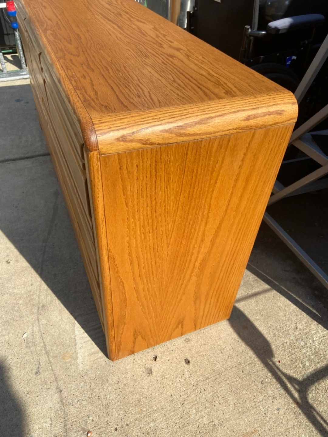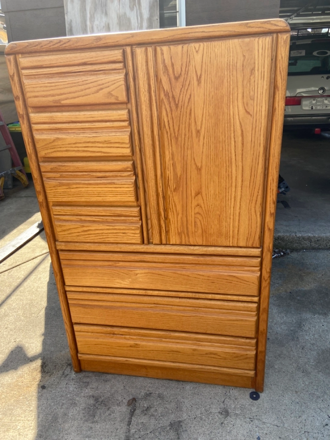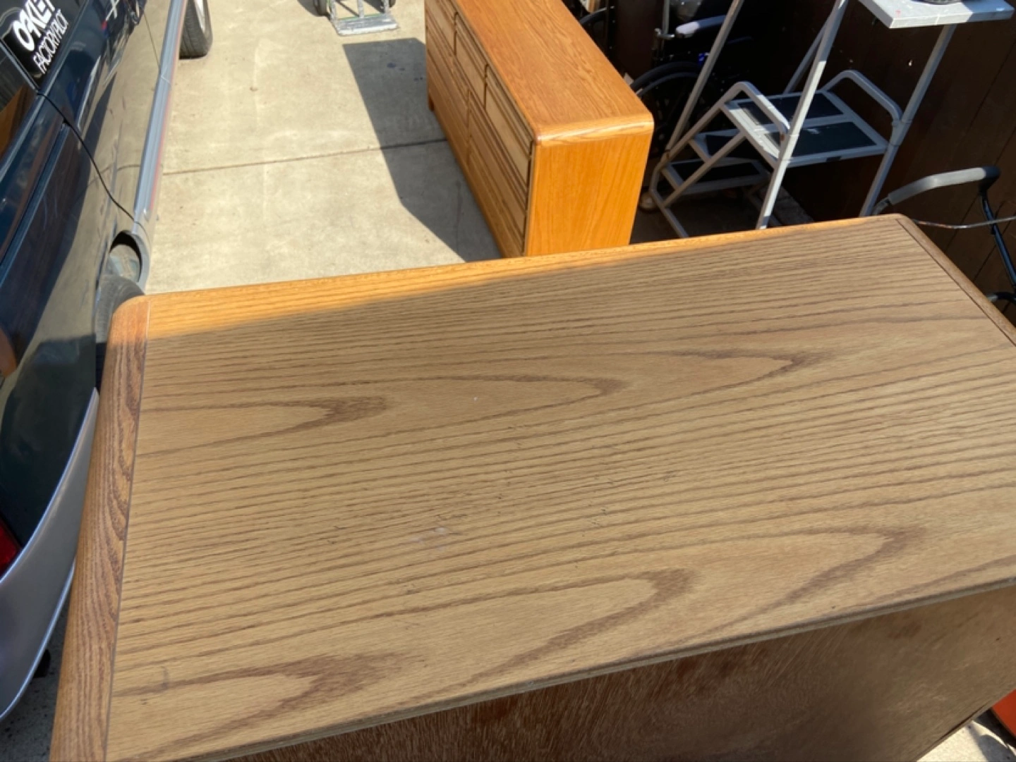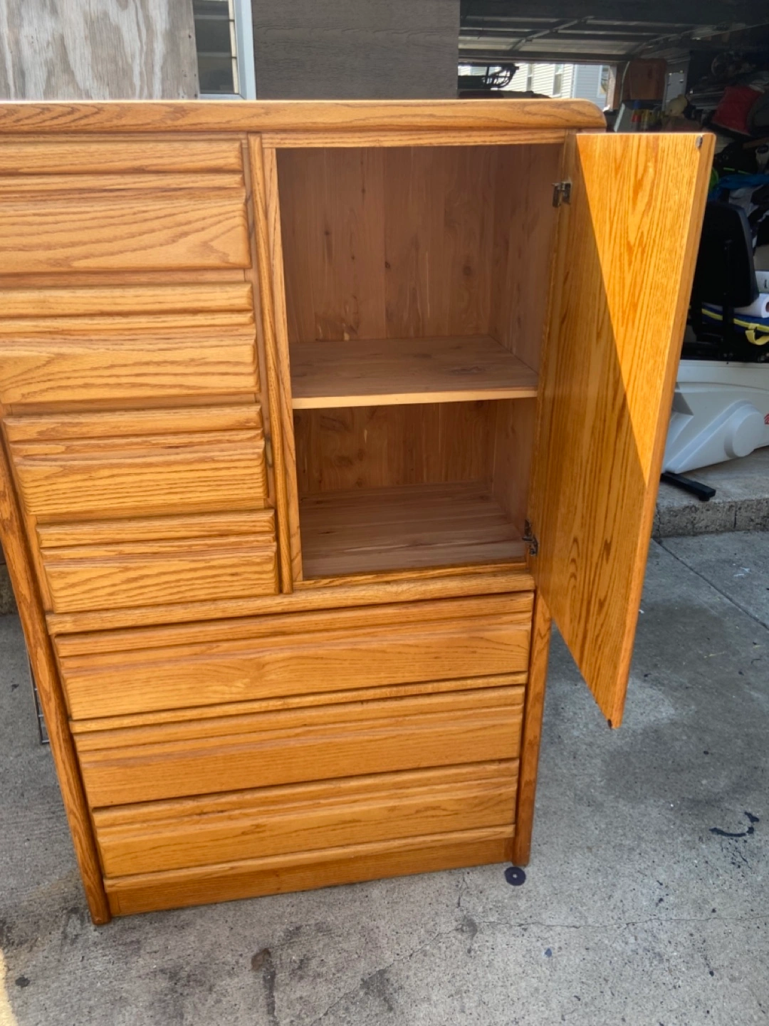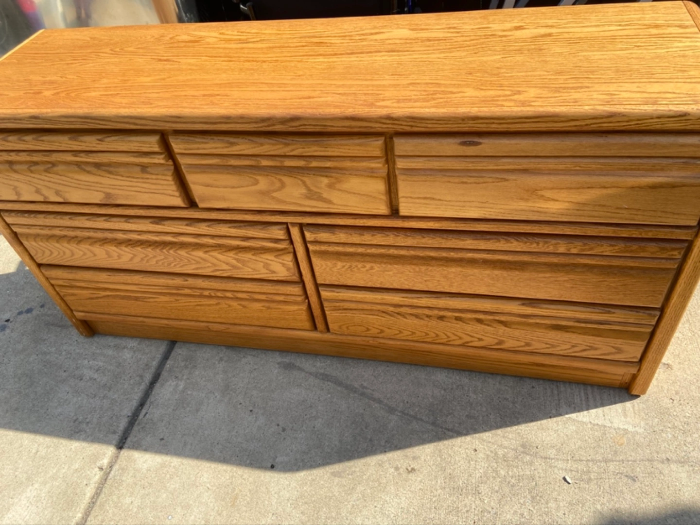 Solid oak wood dresser set. Includes a tall dresser with multiple drawers and a separate double dresser. Plenty of storage space. Good condition.